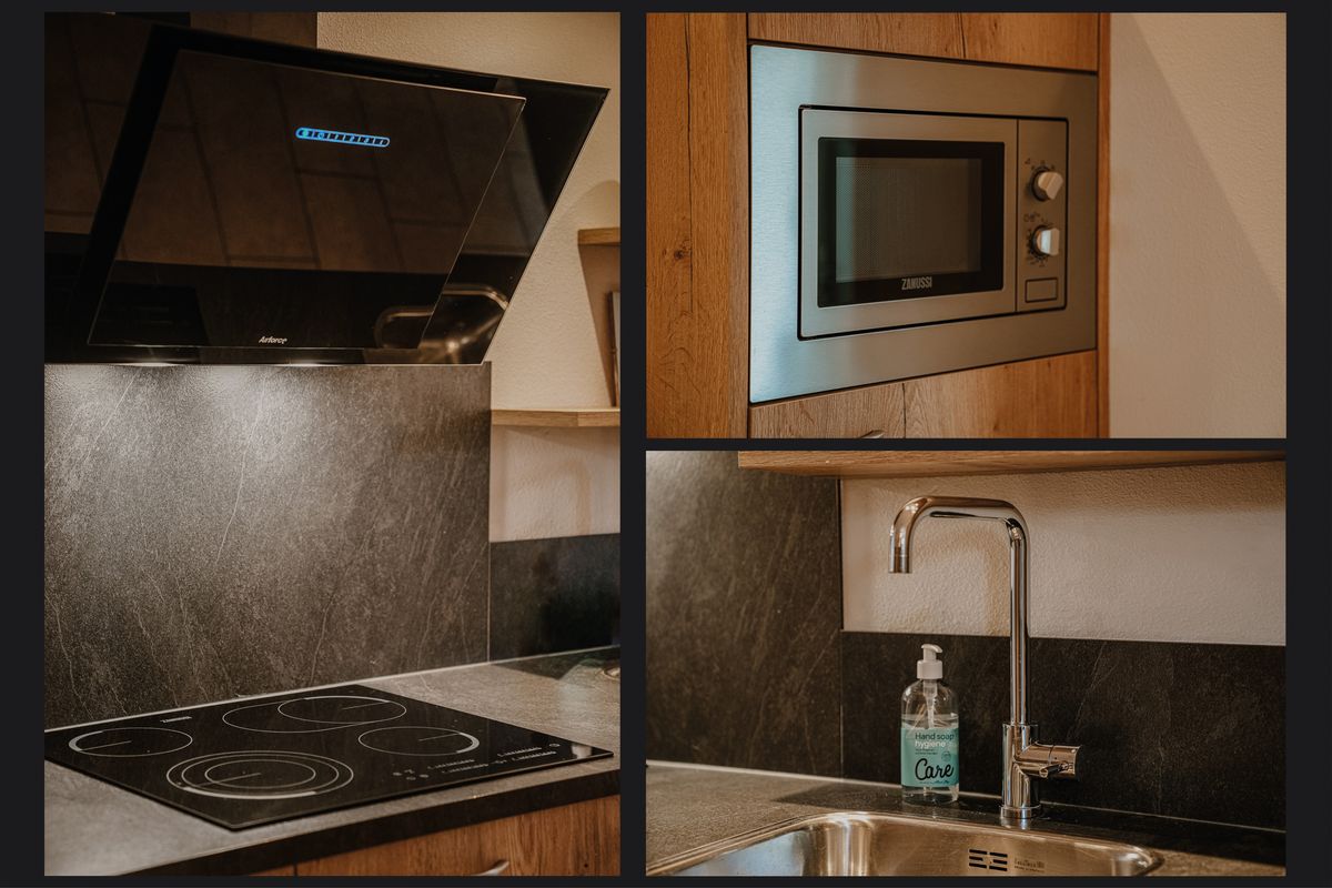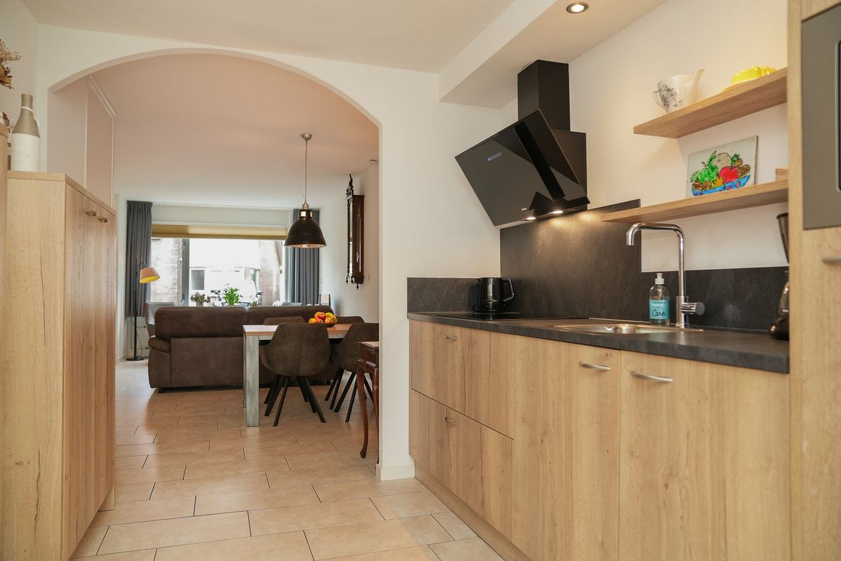De keuken is in 2020 vernieuwd en uitgevoerd in een moderne, houtkleurige opstelling met donker werkblad. Er is inbouwapparatuur aanwezig, waaronder een inductie kookplaat, afzuigkap, combi-oven/magnetron en koelkast. Extra bergruimte is er in de beide wandkasten.