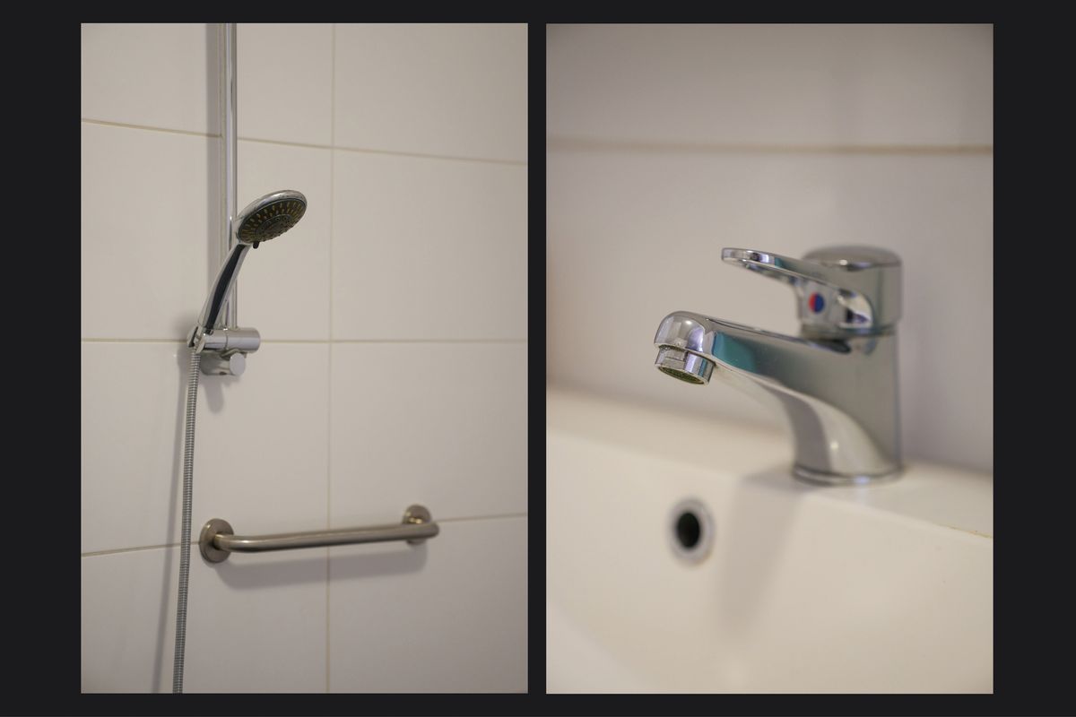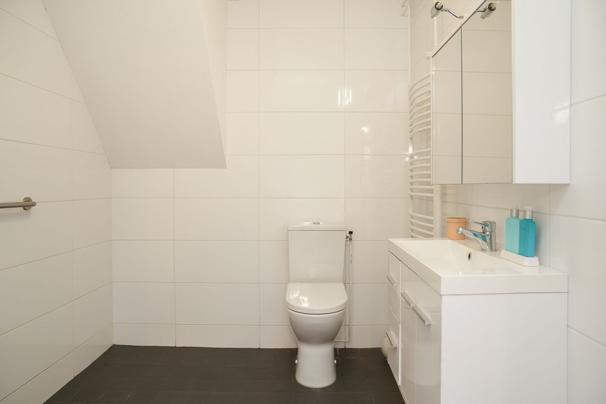 De ruime badkamer is volledig betegeld en uitgerust met een inloopdouche en een wastafelmeubel. Comfortabel en praktisch, zeker voor wie alle voorzieningen op één woonlaag wil.