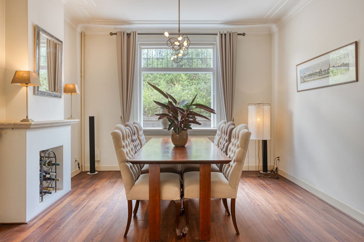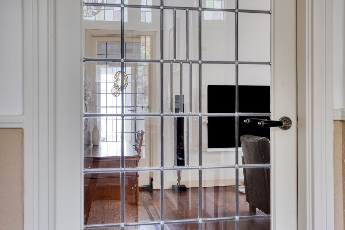 Jouw auto parkeer je op eigen terrein, er is plek voor twee auto's. Daarnaast is er rondom de woning ruimte voor openbaar parkeren. Je hebt de keuze om binnen te komen via de voordeur van de woning of de achterom via de tuin. Vanuit de voordeur bereik je de sfeervolle gang met toegang tot de 1e verdieping en woonkamer. Wat direct opvalt, zijn de karakteristieke elementen, zoals de granito vloer, paneeldeuren en glas-in-loodramen. De woon-/eetkamer is ruim en voorzien van veel grote ramen. De erker geeft extra ruimte en sfeer aan deze kamer. Er is een gashaard voor extra sfeer of eventueel als bijverwarming in de koude wintermaanden. Er is een buitendeur om naar de serre te gaan.