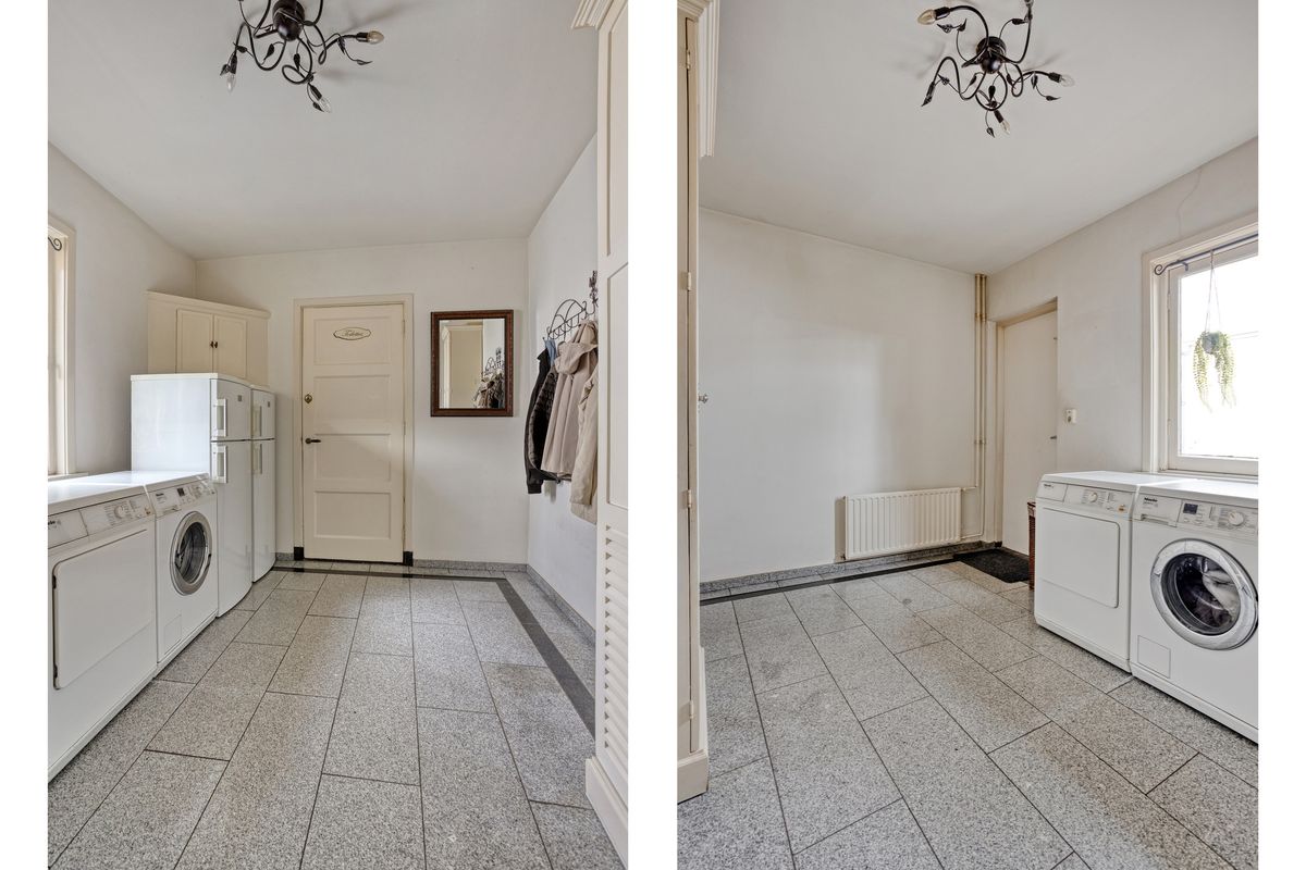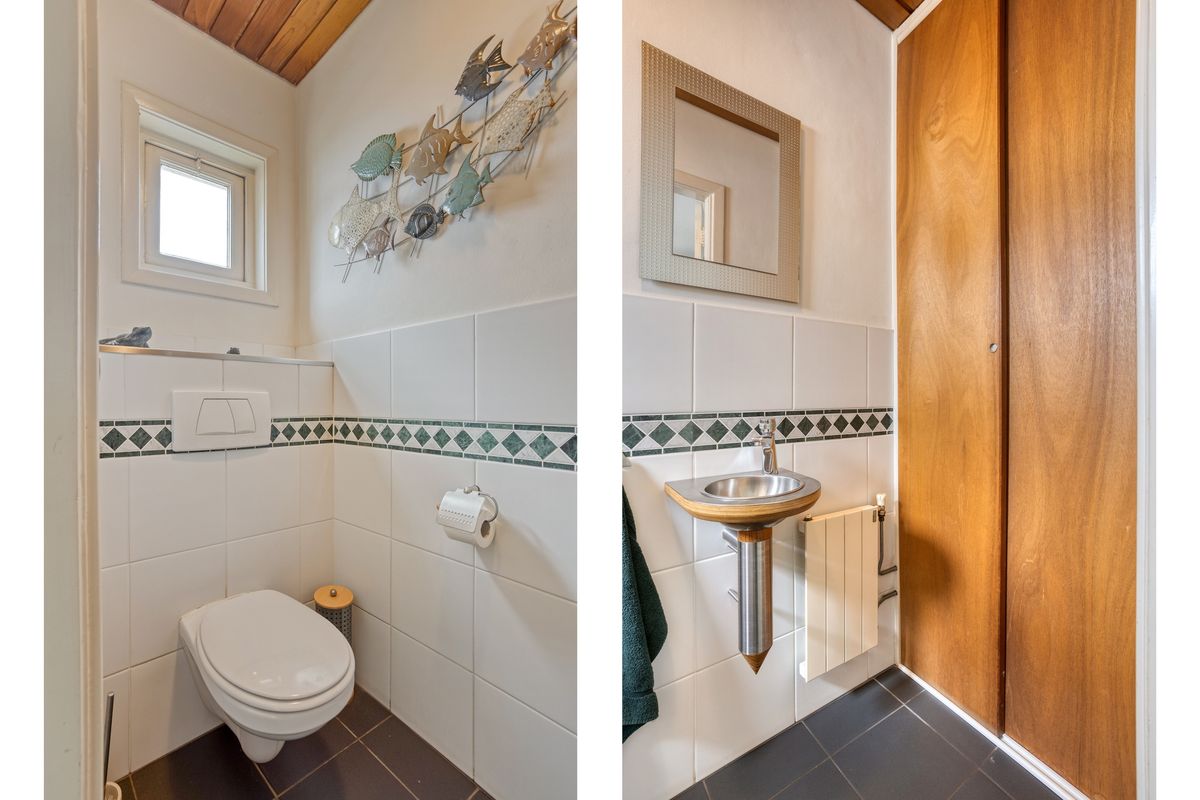Vanuit de keuken heb je een doorgang naar de bijkeuken en toilet. Ideale ruimte voor witgoedapparatuur en opslag. Tevens is hier de achterdeur richting de tuin en oprit.