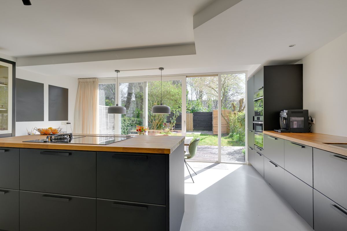 Aan de achterkant van het huis vind je de echte eyecatcher van deze verdieping: een heerlijke woonkeuken met schuifpui naar de tuin. En wat voor keuken! Een stijlvolle combinatie van modern en praktisch: een Quooker, inductiekookplaat mét gaspit voor de liefhebber, dubbele oven (inclusief stoomoven!), een Amerikaanse koelkast en natuurlijk een vaatwasser die het werk uit je handen neemt. Perfect voor een druk gezin of als je graag vrienden over de vloer hebt. Je schuift de pui open en voilà – binnen en buiten worden één. Denk: zwoele zomeravonden, kabbelende muziek, kinderen in het gras, jij met een wijntje bij de tuintafel.