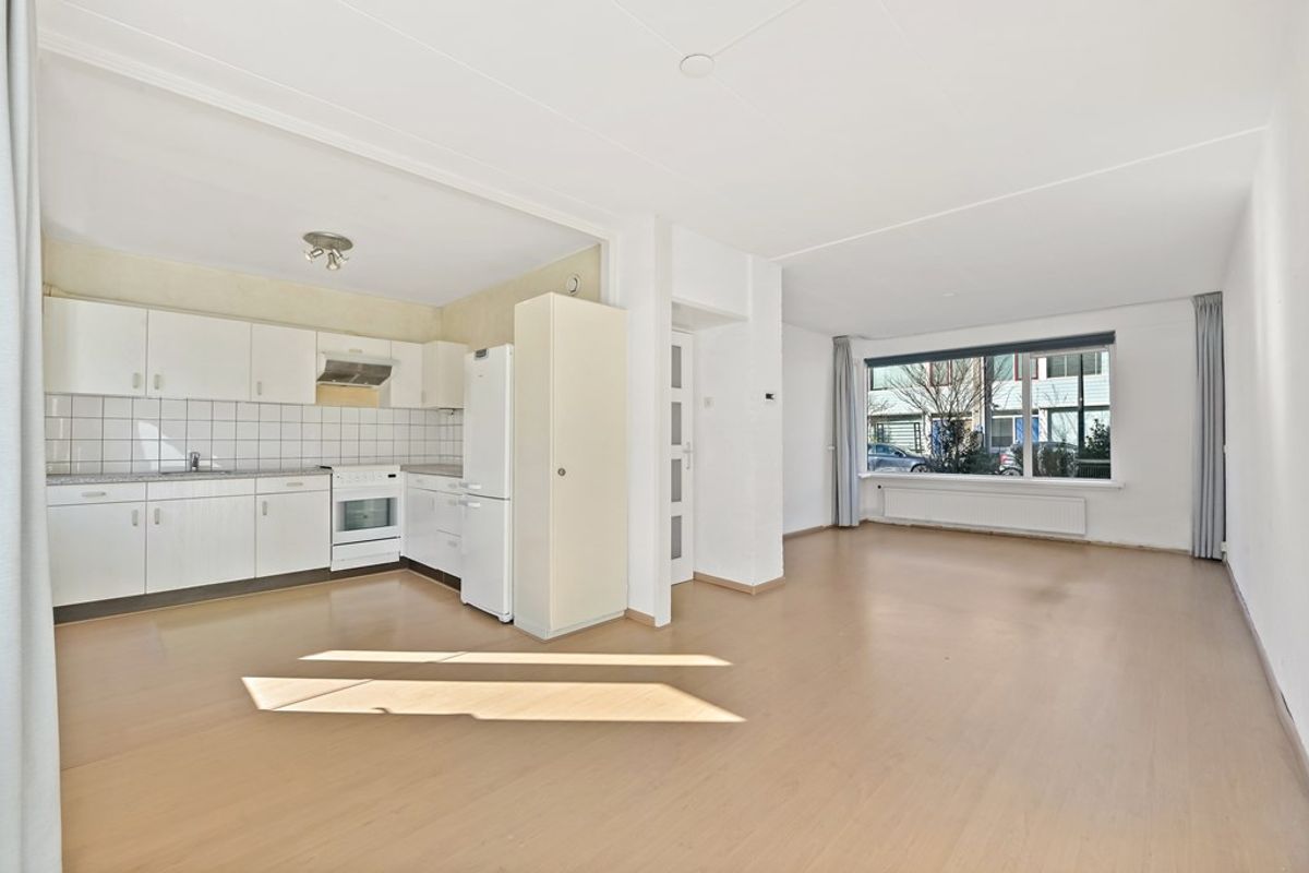 Via de voortuin bereikt u de entree van de woning. De hal biedt toegang tot de toiletruimte met fonteintje, voorraadkast, meterkast (vernieuwd), trapopgang naar de eerste verdieping en de woonkamer. De woonkamer zelf is heerlijk licht dankzij de grote raampartijen en de sfeervolle erker aan de voorzijde. De open keuken is aan de achterzijde gelegen, uitgevoerd in een L-opstelling en voorzien van diverse apparatuur zoals een gasfornuis, afzuigkap, oven en een koel/vriescombinatie. Aan de achterzijde van de woning is de breedte van de woning goed zichtbaar. Door middel van de loopdeur is de heerlijk zonnig gelegen achtertuin te bereiken. Dankzij de ligging op het zuiden kun je hier de gehele dag van de zon genieten. Achterin de tuin staat een grote gemetselde berging, waarvan een gedeelte is overkapt. Via de overkapping is de poort aan de achterzijde te bereiken.