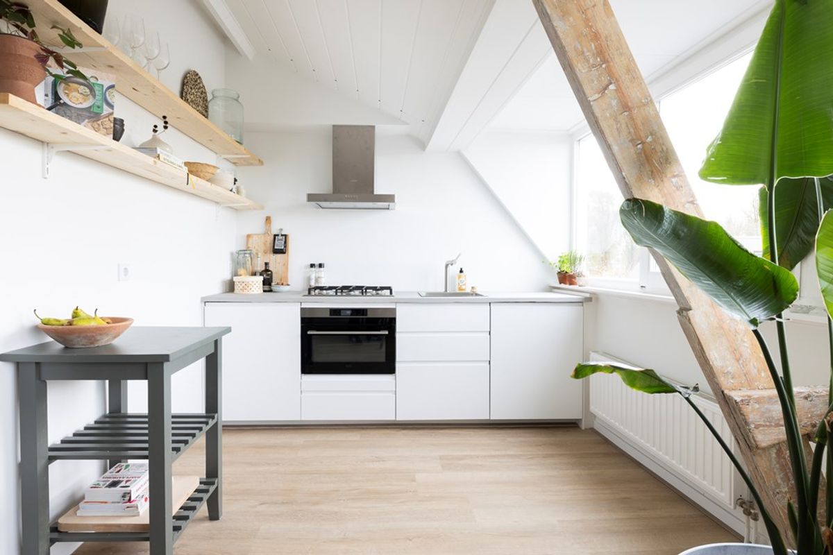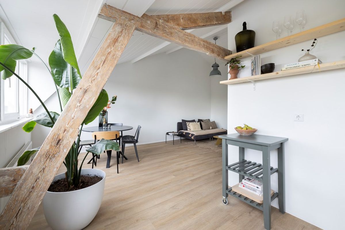 On the second floor you enter the hall, which provides access to the various rooms. At the front is the living room with open kitchen. There are windows across the full width which, together with the south-facing position, bring in lots of light. The living room has a ceiling height at the ridge of almost 4 metres, creating a wonderful sense of space. Have you noticed the beautiful wooden beams? Next to the kitchen there is a fixed staircase to the sleeping loft. Here you’ll find an extra room with playful shutters overlooking the living room. There is also a roof window for lovely daylight. At the rear of the home you’ll find the large bedroom and the bathroom with vanity, shower and washing machine connection. Off the hall is the separate toilet.