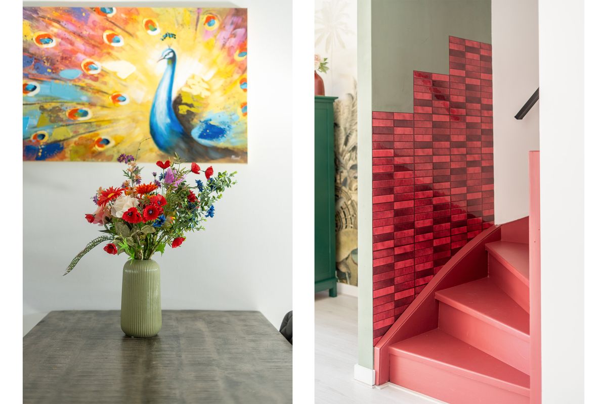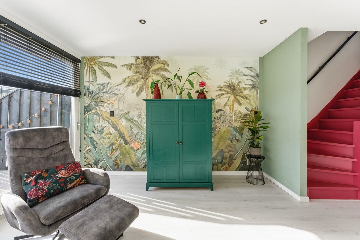 Woonkamer: De ruime woonkamer ligt op de eerste verdieping en biedt veel licht dankzij de grote schuifpui aan de achterzijde. Via deze schuifpui stap je het balkon op, met een trap die leidt naar de tuin. De woonkamer is verzorgd afgewerkt en beschikt over een praktische inbouwkast. De trap naar de tweede verdieping bevindt zich in de woonkamer. De afwerking bestaat uit laminaat, behang en glasvliesbehang, met een gips plafond.