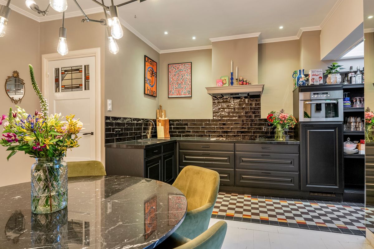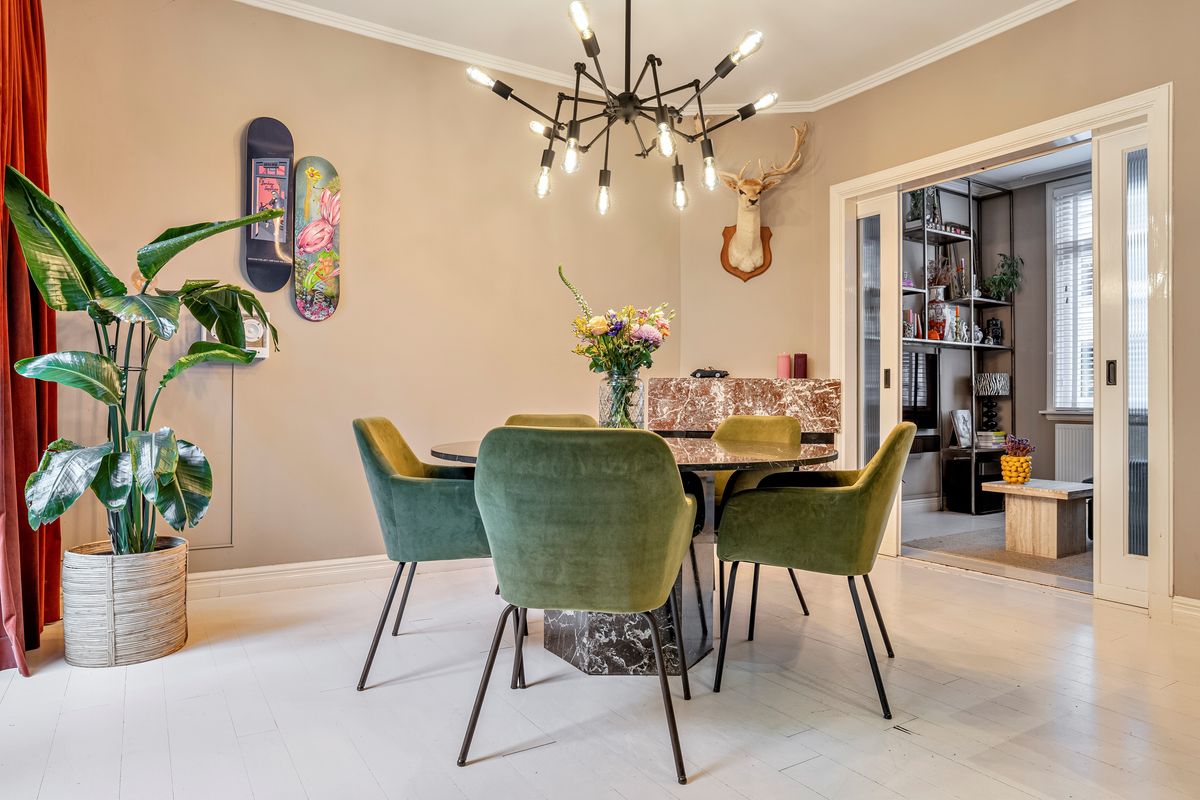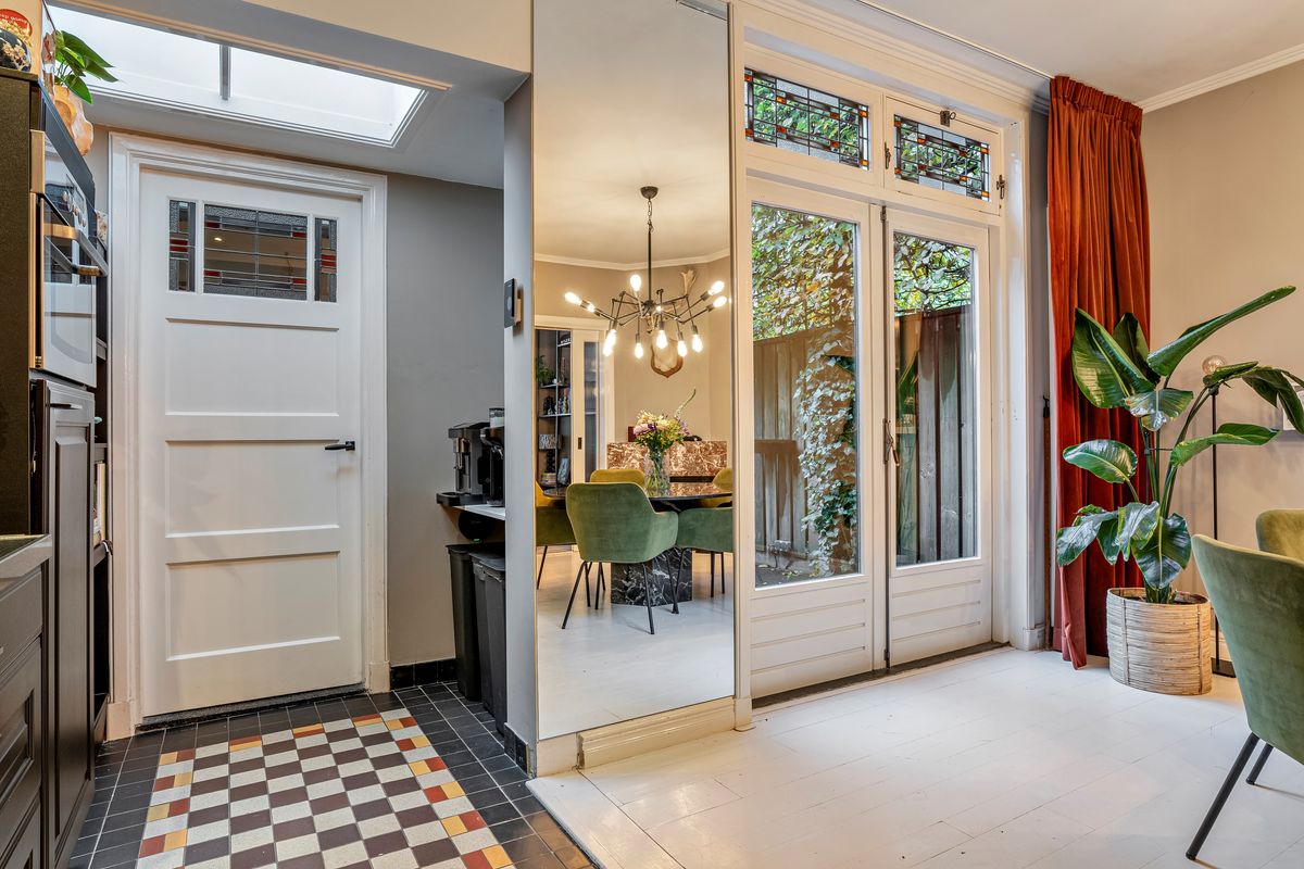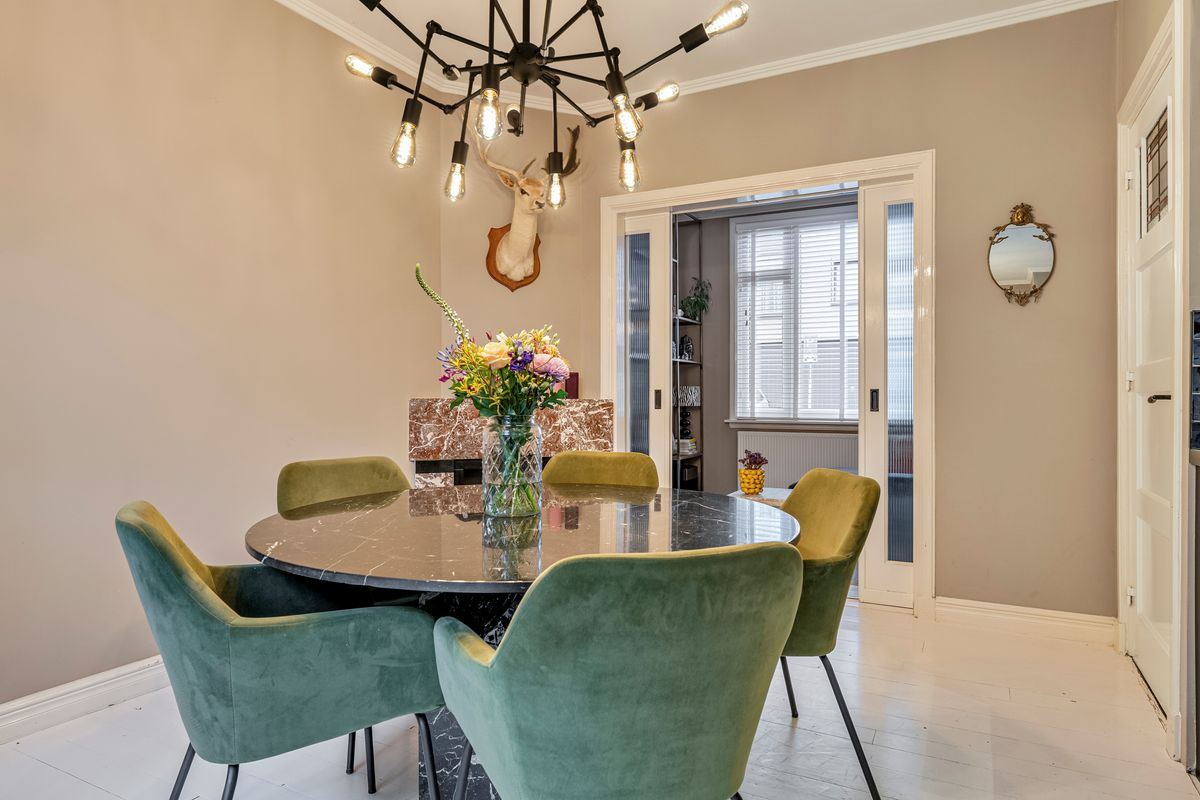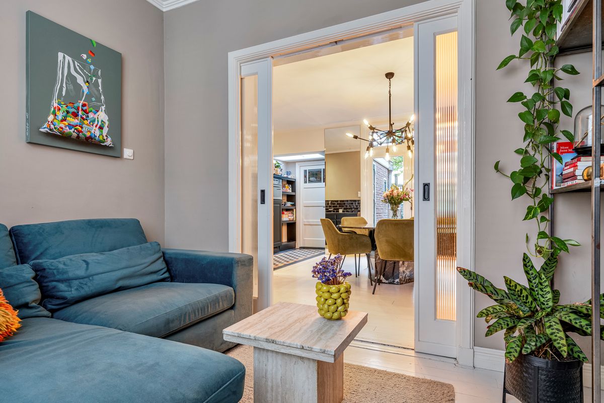 Bij binnenkomst betreed je de fraaie hal met authentieke tegelvloer en toegang tot de trapopgang naar de eerste verdieping, trapkast met vernieuwde meterkast én de woonkamer. De kamer-en-suite met originele schuifdeuren zorgt voor een knusse en stijlvolle indeling met een gezellige voorkamer en een ruime achterkamer met openslaande tuindeuren, waar de zithoek is gesitueerd. De hoge plafonds, glas-in-loodramen en marmeren schouw geven het geheel een warme, klassieke uitstraling.