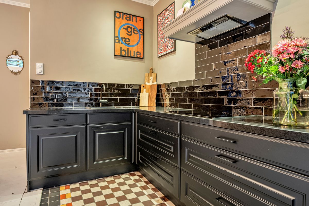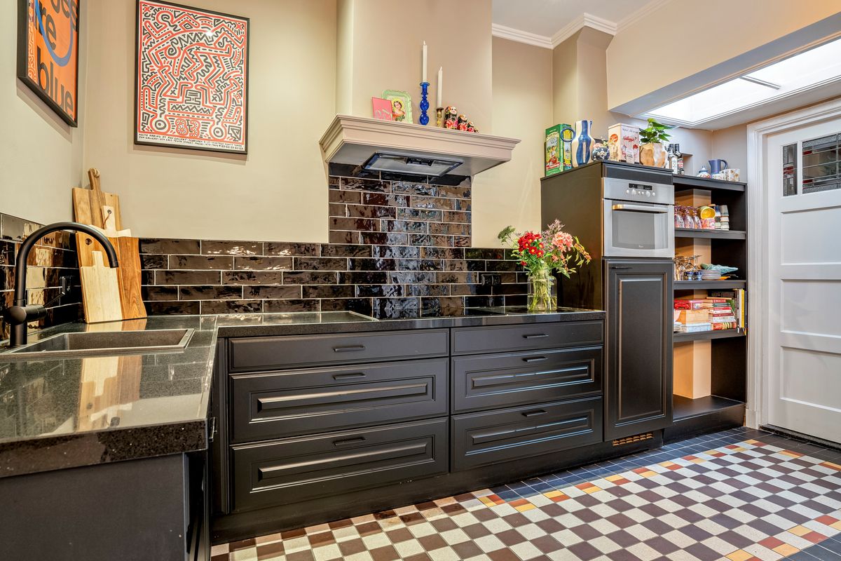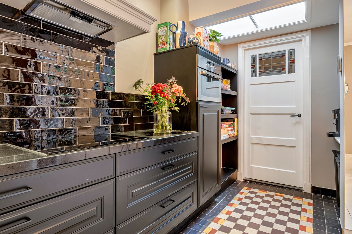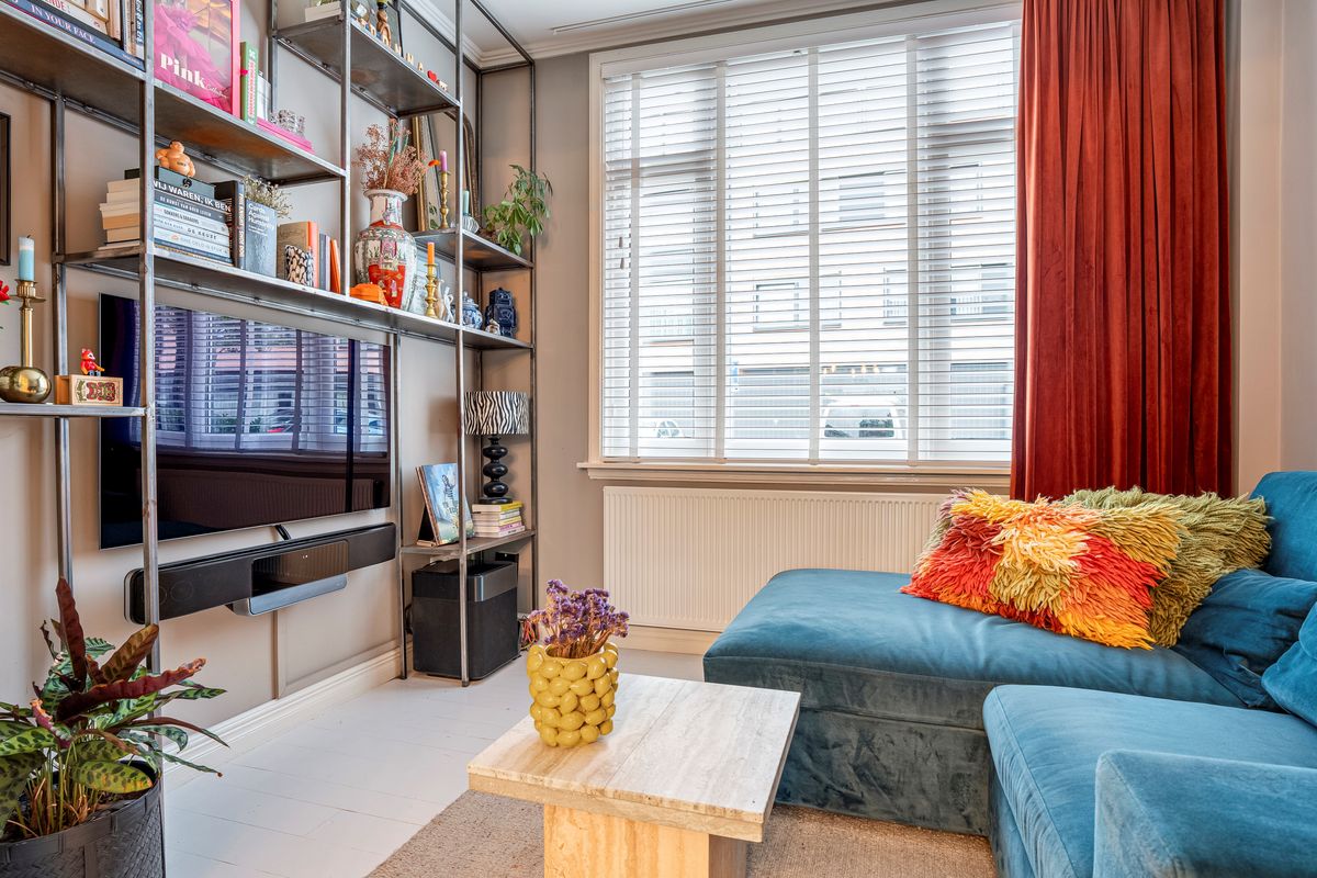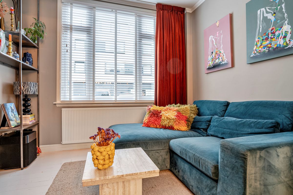 Bij binnenkomst betreed je de fraaie hal met authentieke tegelvloer en toegang tot de trapopgang naar de eerste verdieping, trapkast met vernieuwde meterkast én de woonkamer. De kamer-en-suite met originele schuifdeuren zorgt voor een knusse en stijlvolle indeling met een gezellige voorkamer en een ruime achterkamer met openslaande tuindeuren, waar de zithoek is gesitueerd. De hoge plafonds, glas-in-loodramen en marmeren schouw geven het geheel een warme, klassieke uitstraling.