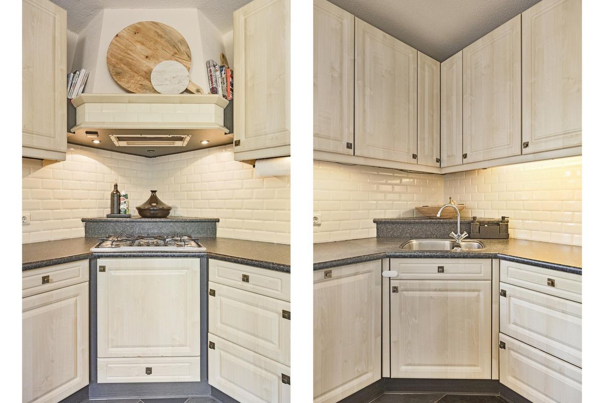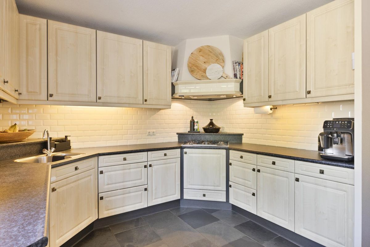 - Halfopen keuken met 5-pits gaskookplaat, afzuigkap, koelkast en vaatwasmachine.