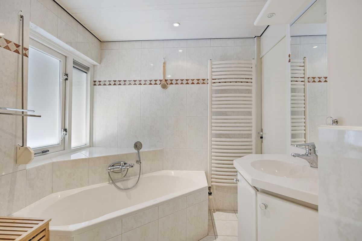 Op de eerste verdieping vind je twee slaapkamers, waarvan één royaal, met een strakke laminaatvloer en een complete badkamer met ligbad, douchecabine, toilet en een fraai badmeubel. De tweede verdieping biedt nog een fijne extra slaapkamer én een overloop met cv-opstelling en aansluitingen voor het witgoed.