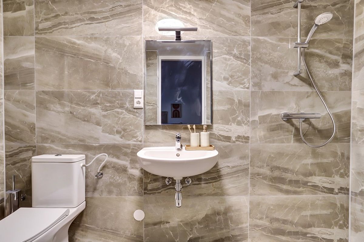 • Bathroom accessible from the living room, featuring a walk-in shower, washbasin and toilet