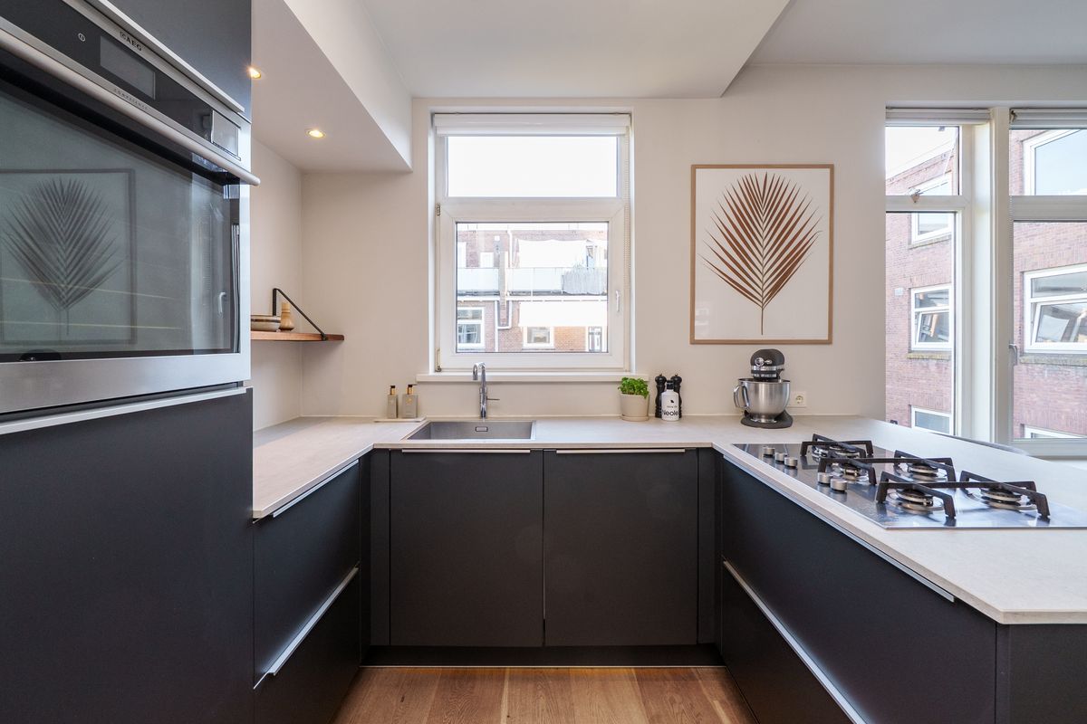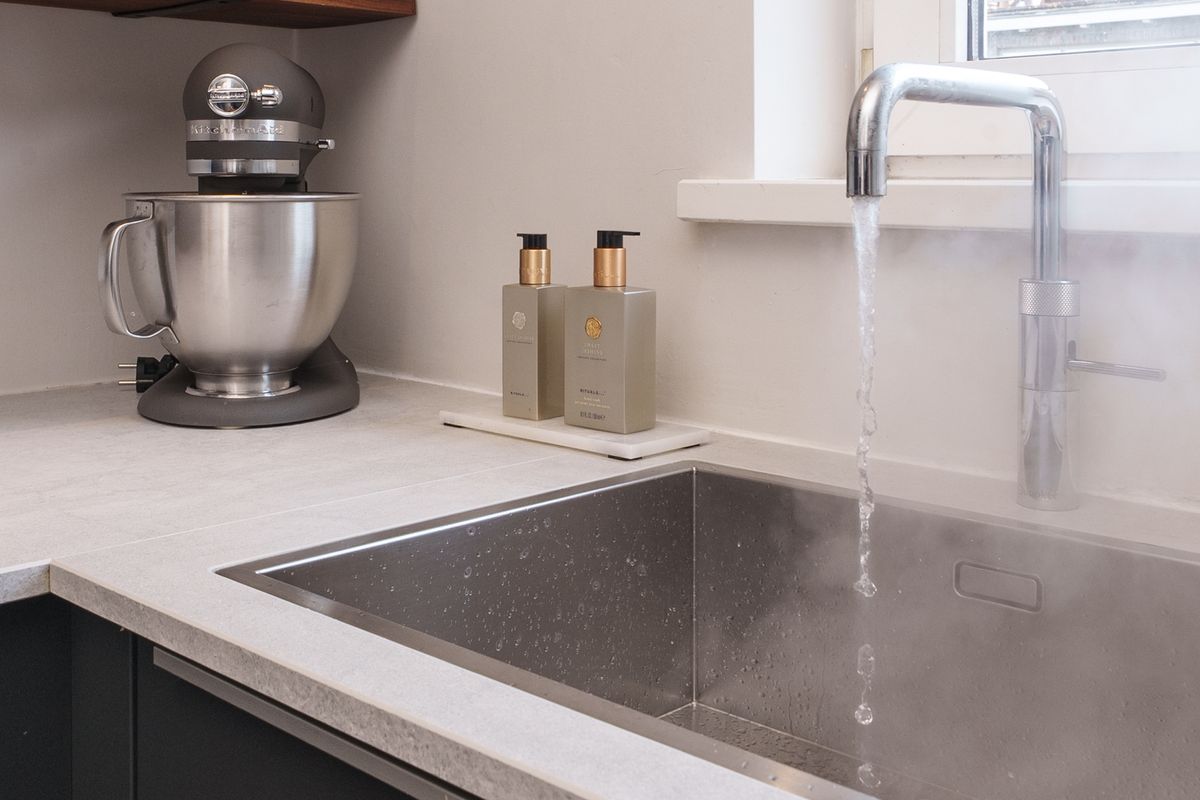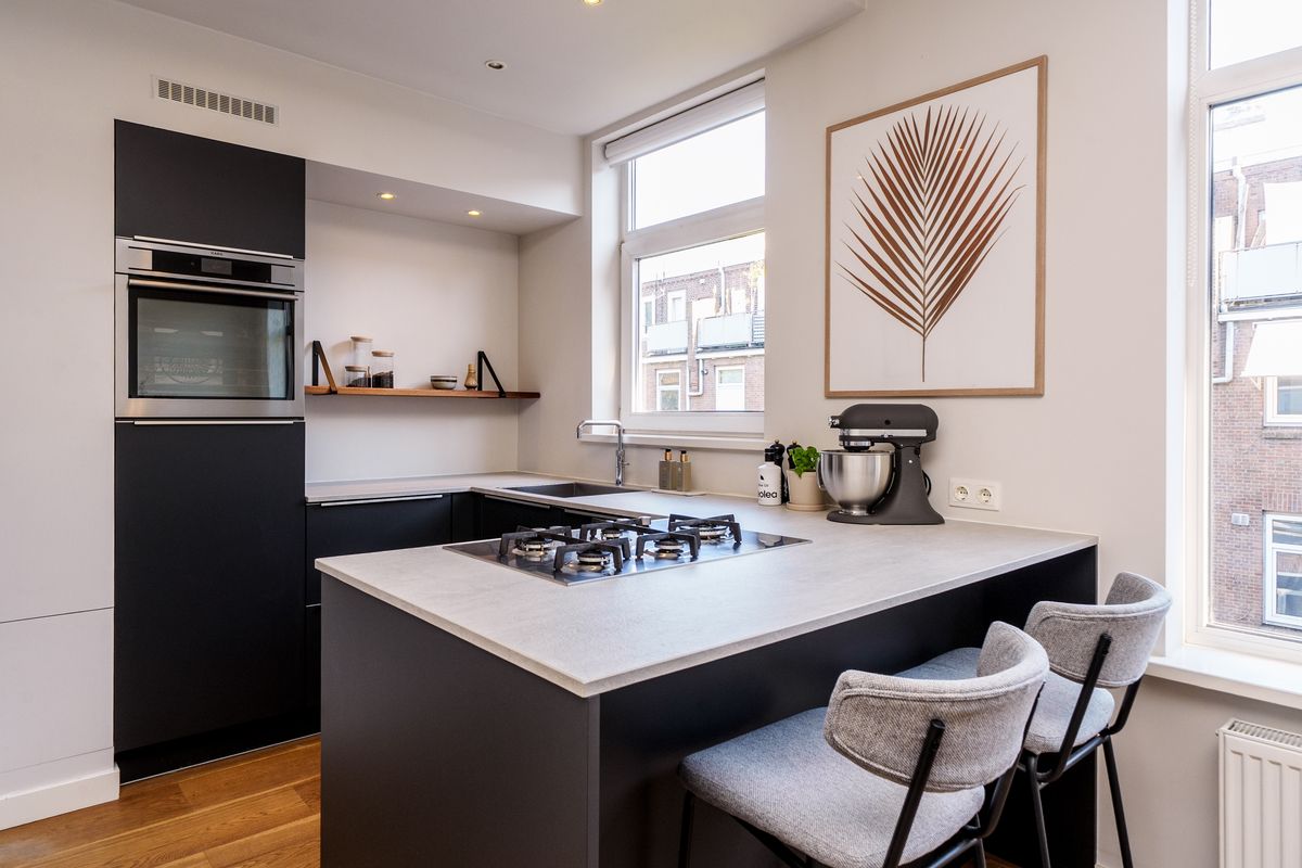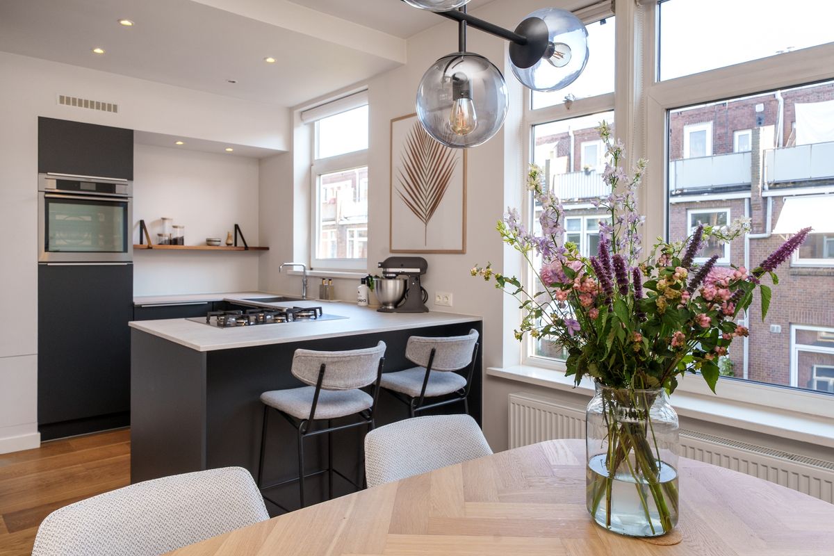 De moderne, U-vormige keuken is uitgevoerd in stijlvol antraciet en afgewerkt met een lichtgrijs aanrechtblad. Dankzij de hoekopstelling is er ruimte gecreëerd voor barkrukken, wat zorgt voor een keukeneiland-gevoel – een ideale plek om samen te koken of gezellig te borrelen. De keuken is van alle gemakken voorzien, een spoelbak met Quooker, een XL vaatwasser, een 5-pits gaskookplaat, een inbouwstoomoven en een koelkast. Het plafond is voorzien van dimbare inbouwspots die zorgen voor een sfeervolle en strakke afwerking.