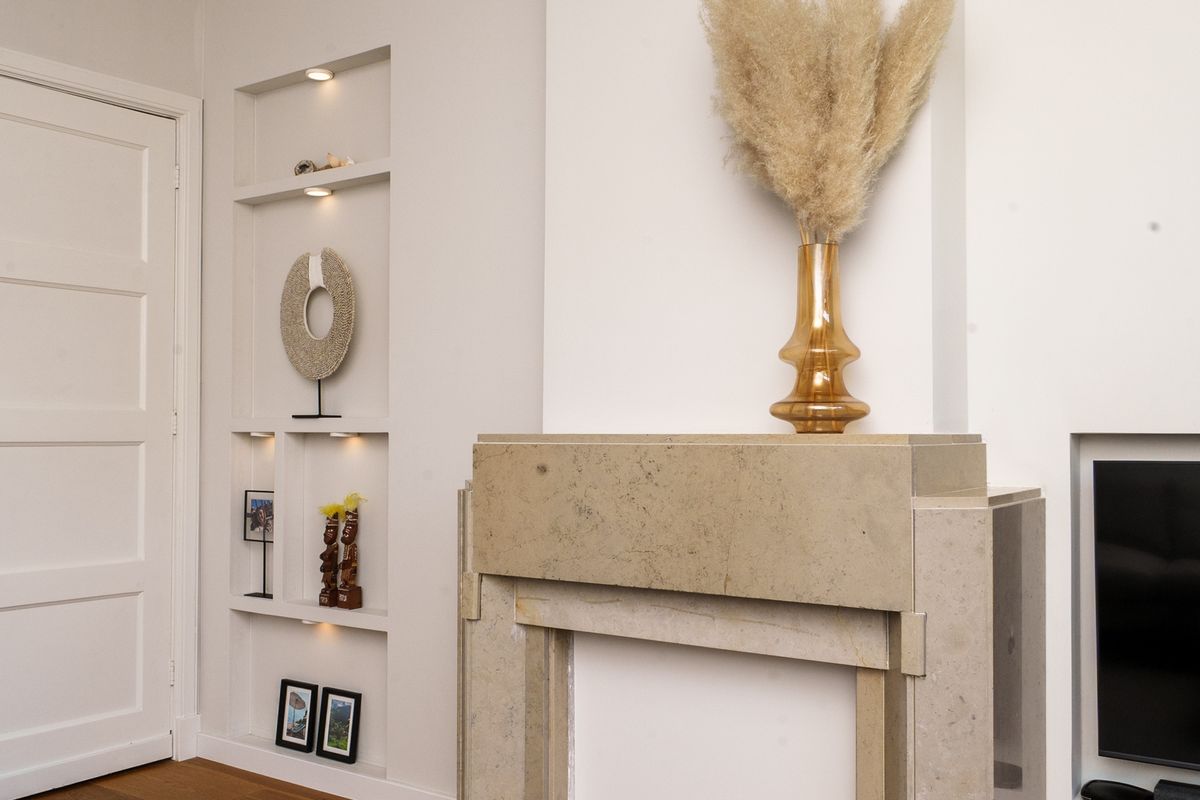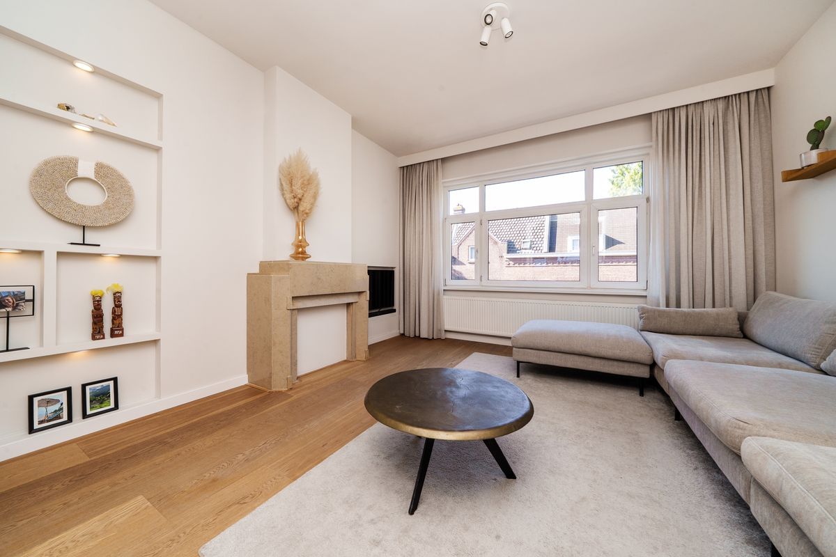 De woonkamer is gelegen aan de voorzijde en beschikt over een originele marmeren schouw en een prachtige cinewall met ruimte voor de televisie en het tonen van kunst en/of herinneringen.