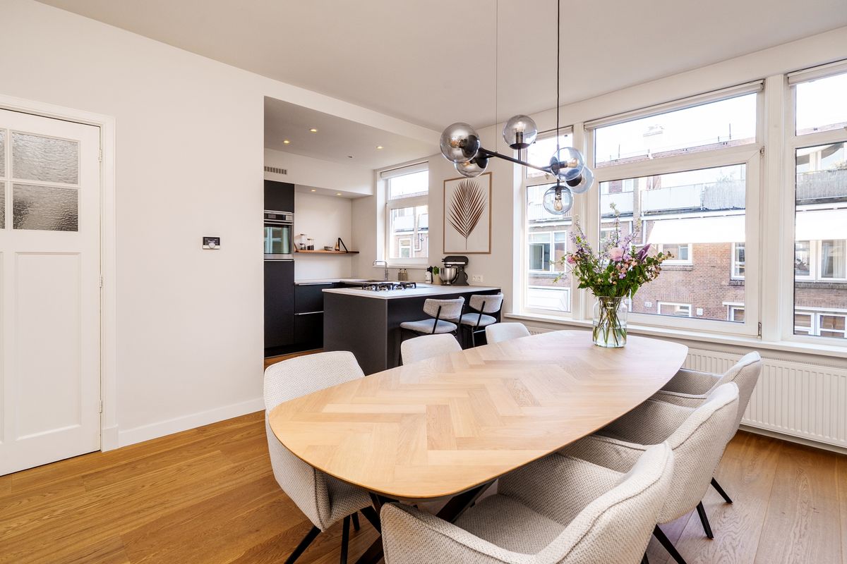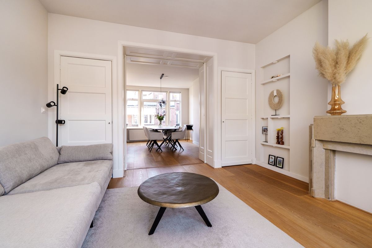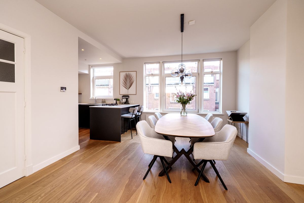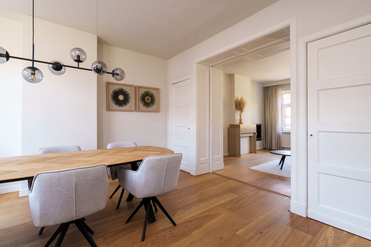 De achterkamer doet dienst als eetkamer met open keuken en wordt door ensuite schijfdeuren met vaste kasten en mooie paneeldeuren gescheiden van de woonkamer. Er is genoeg ruimte voor een fijne royale eettafel. De ruimte is sfeervol, met veel natuurlijk licht dankzij de grote raampartijen.