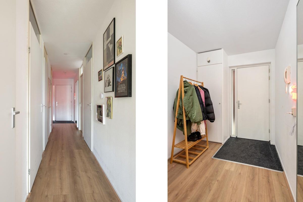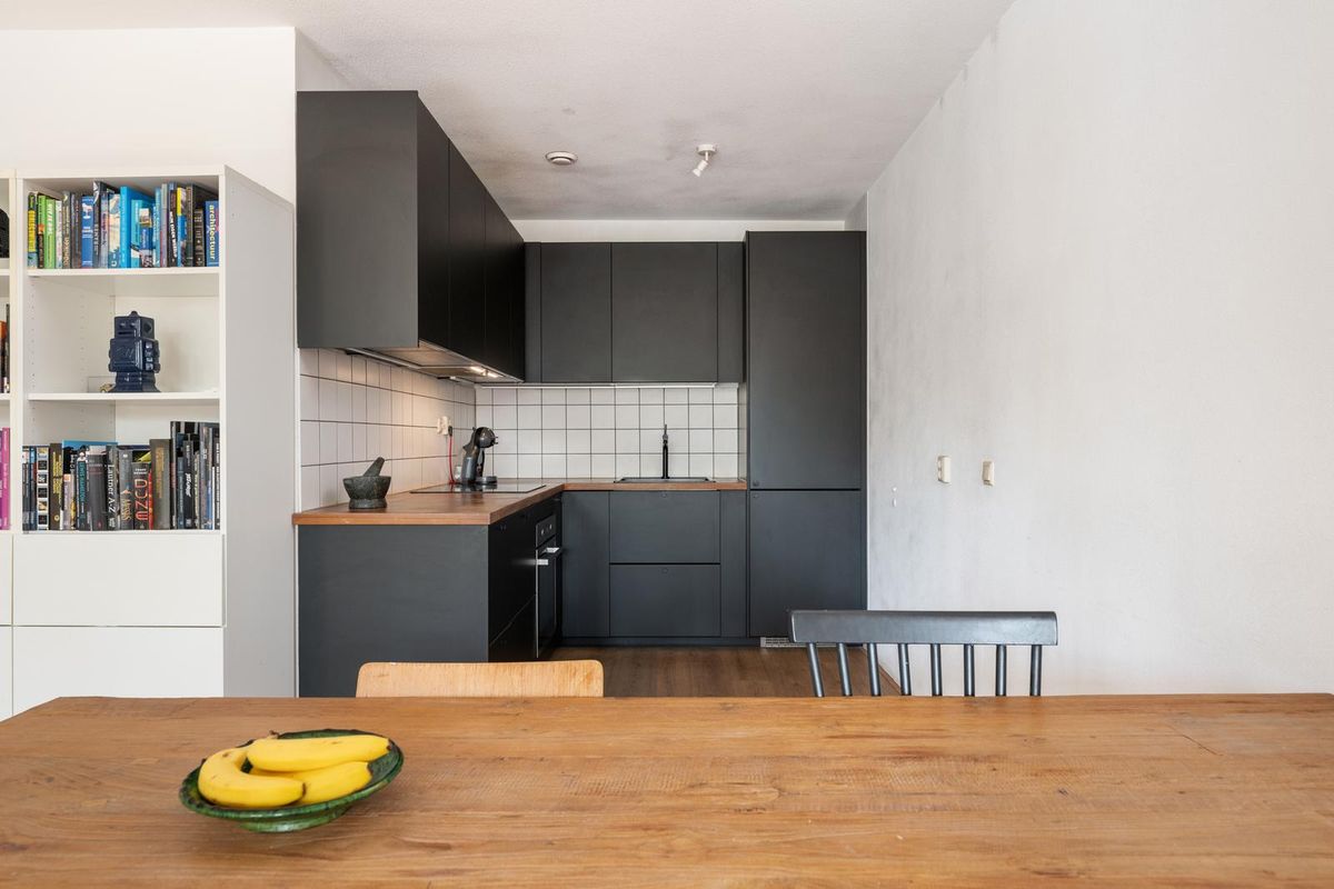 Op de tweede verdieping bereik je via de galerij de voordeur, die toegang geeft tot de hal waar alle vertrekken op uitkomen. De woonkamer ligt aan de voorzijde en dankzij de ligging op het zuiden geniet je hier de hele dag van een prettige lichtinval. Doordat er geen directe bebouwing voor het complex staat, is het uitzicht vrij en heb je bovendien geen inkijk. De open keuken in 2020 vernieuwd en sluit mooi aan op de woonkamer en heeft een eigentijdse, retro uitstraling met witte vierkante tegeltjes, zwarte kasten en een houtkleurig werkblad. Een fijne plek om te koken en gezellig samen te zijn.