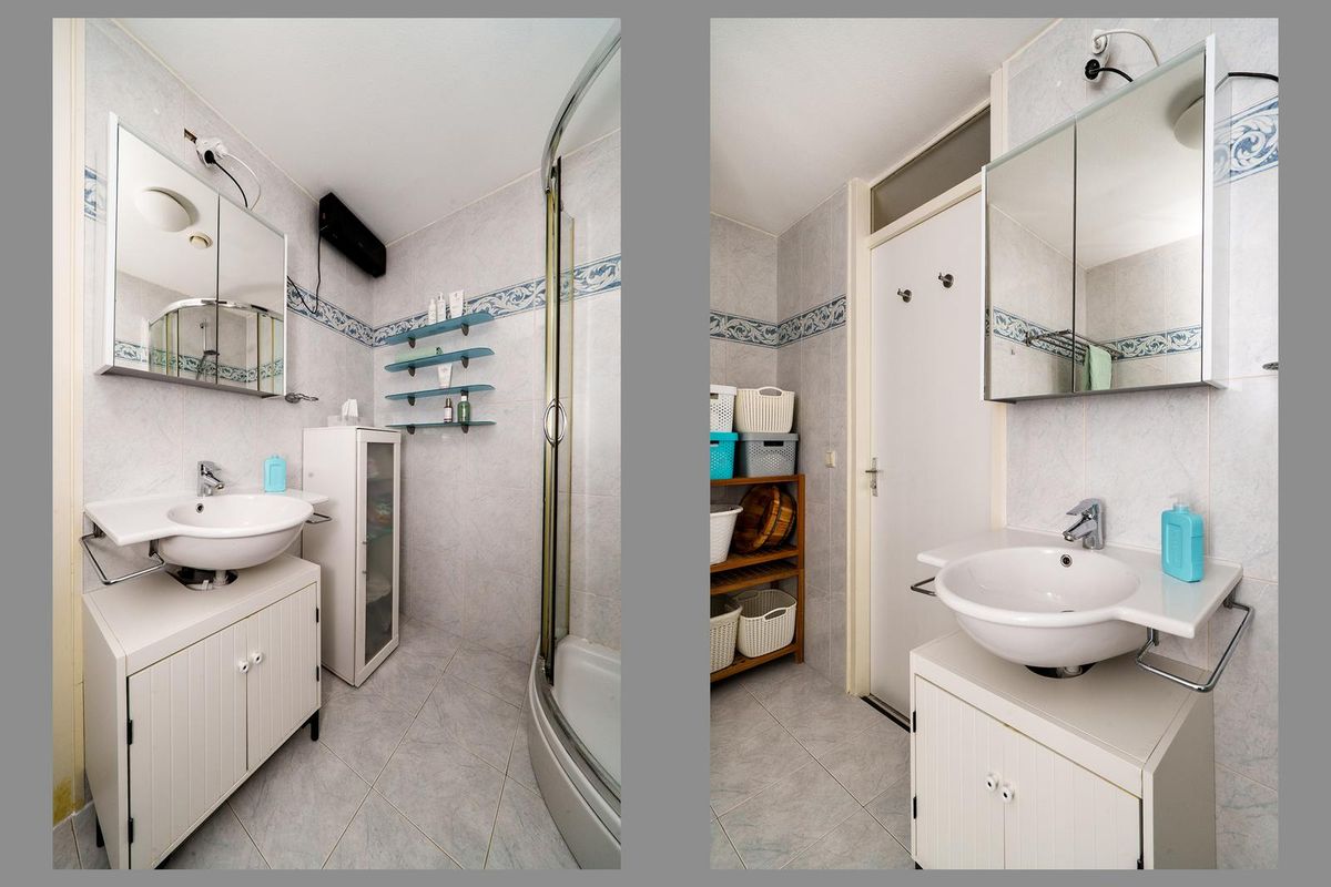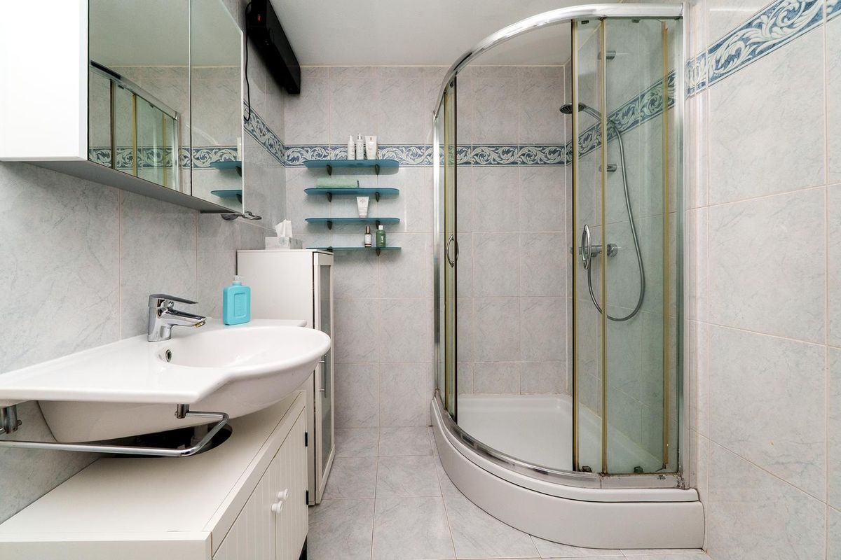 * Badkamer volledig betegeld en voorzien van een douchecabine en een wastafel.