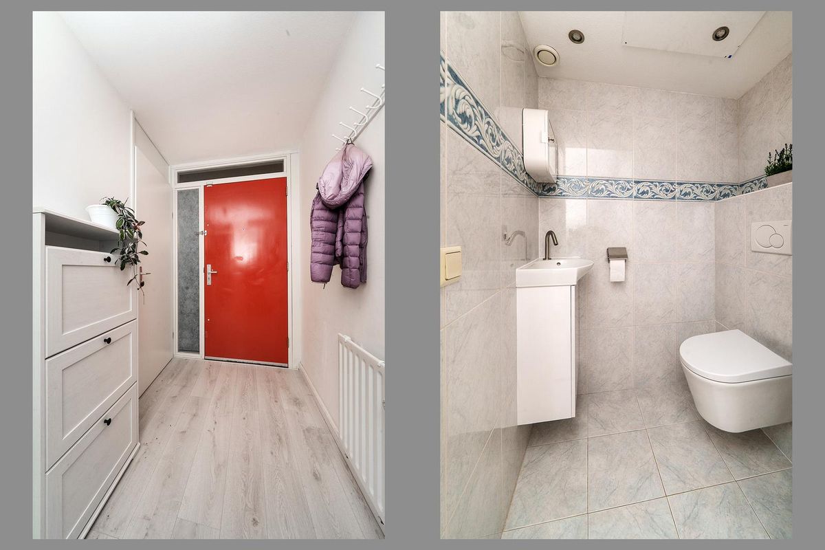 * Entree, woning, hal, volledig betegelde toiletruimte met een zwevend toilet en fontein.