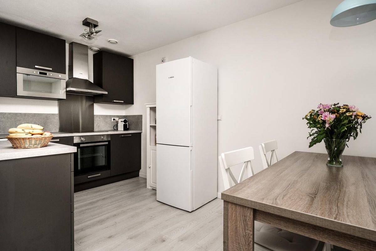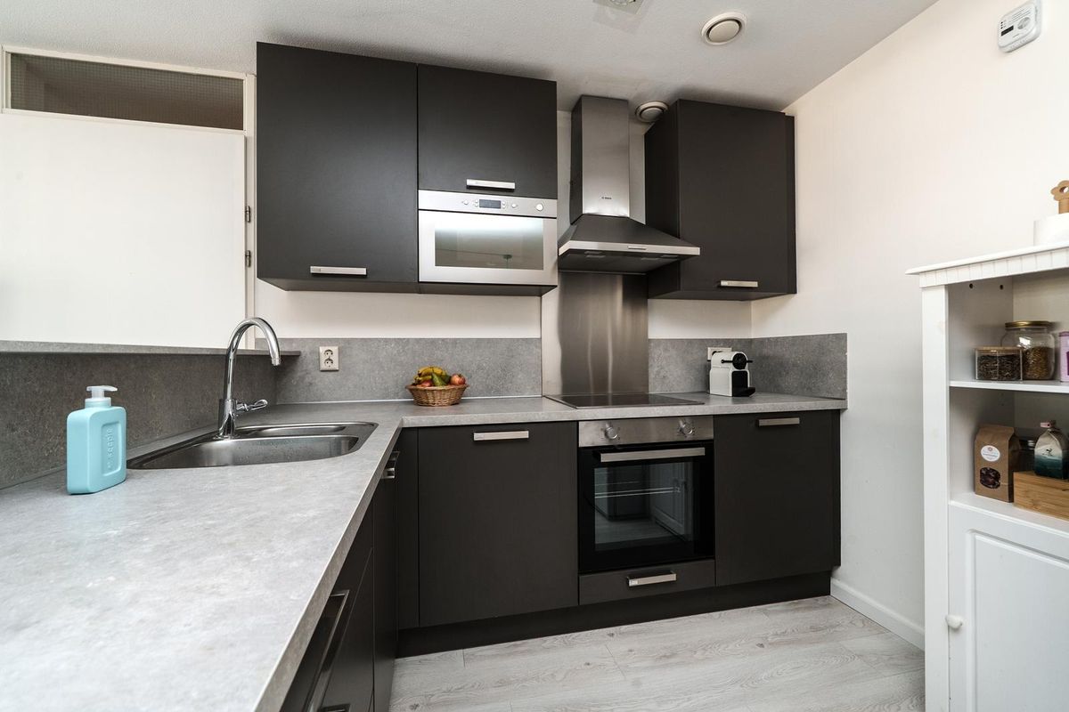 * Open keuken in hoekopstelling en voorzien van diverse inbouwapparatuur, zoals een keramische kookplaat, afzuigkap, oven, magnetron en een vaatwasser.