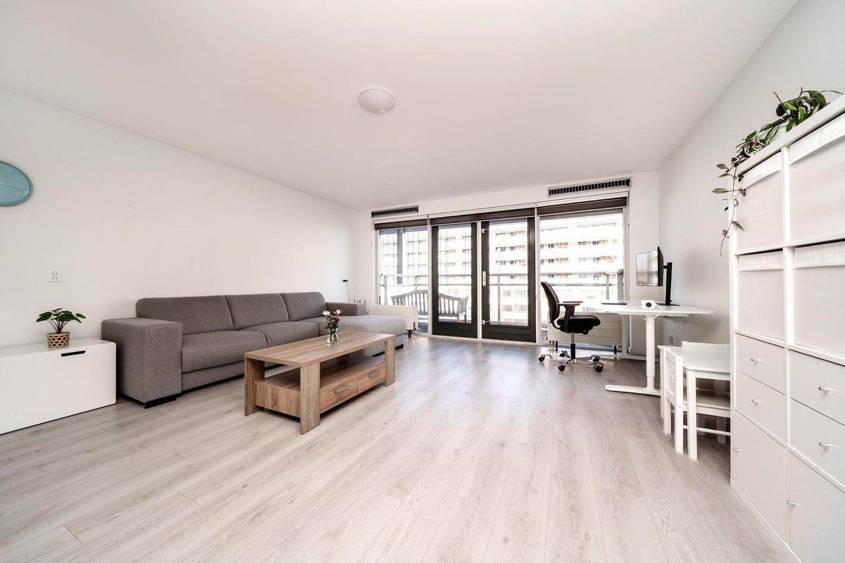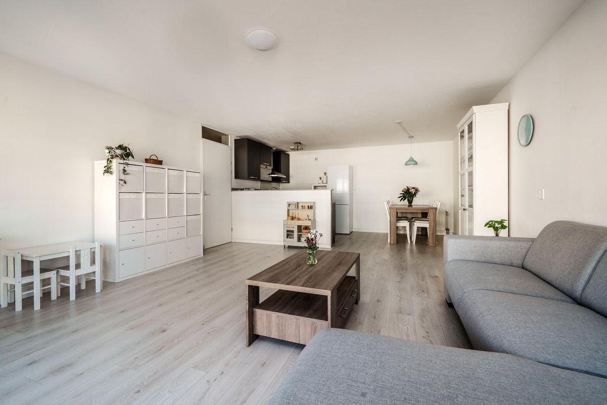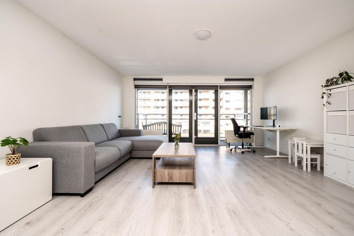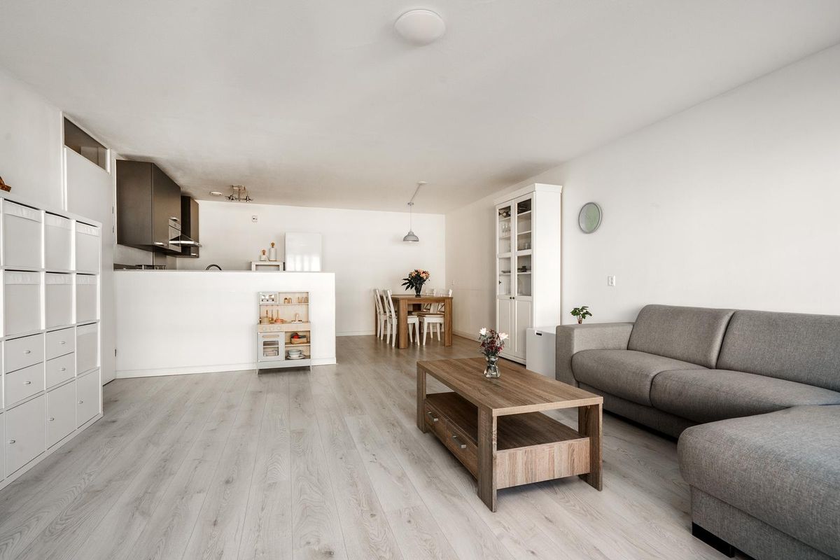 * Woonkamer met halfopen keuken, totaal ± 40 m² groot, met toegang tot het balkon op het Zuidwesten