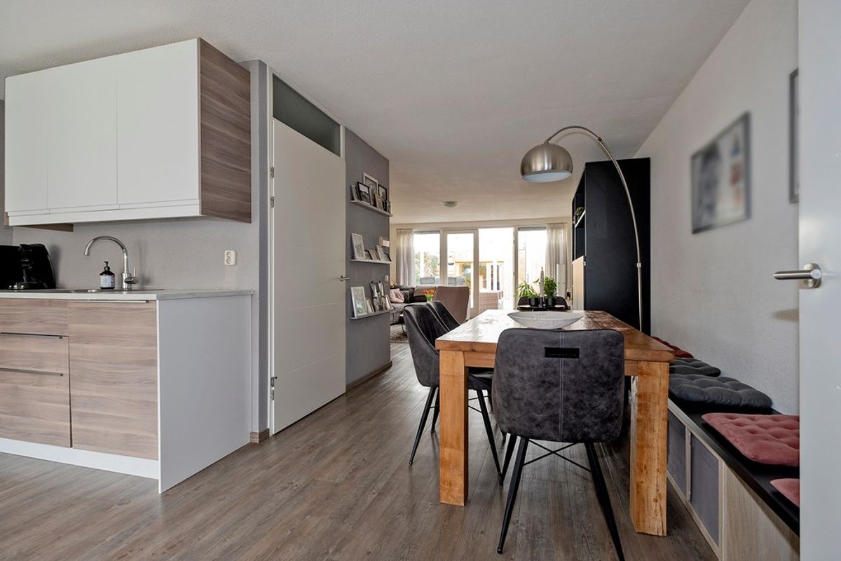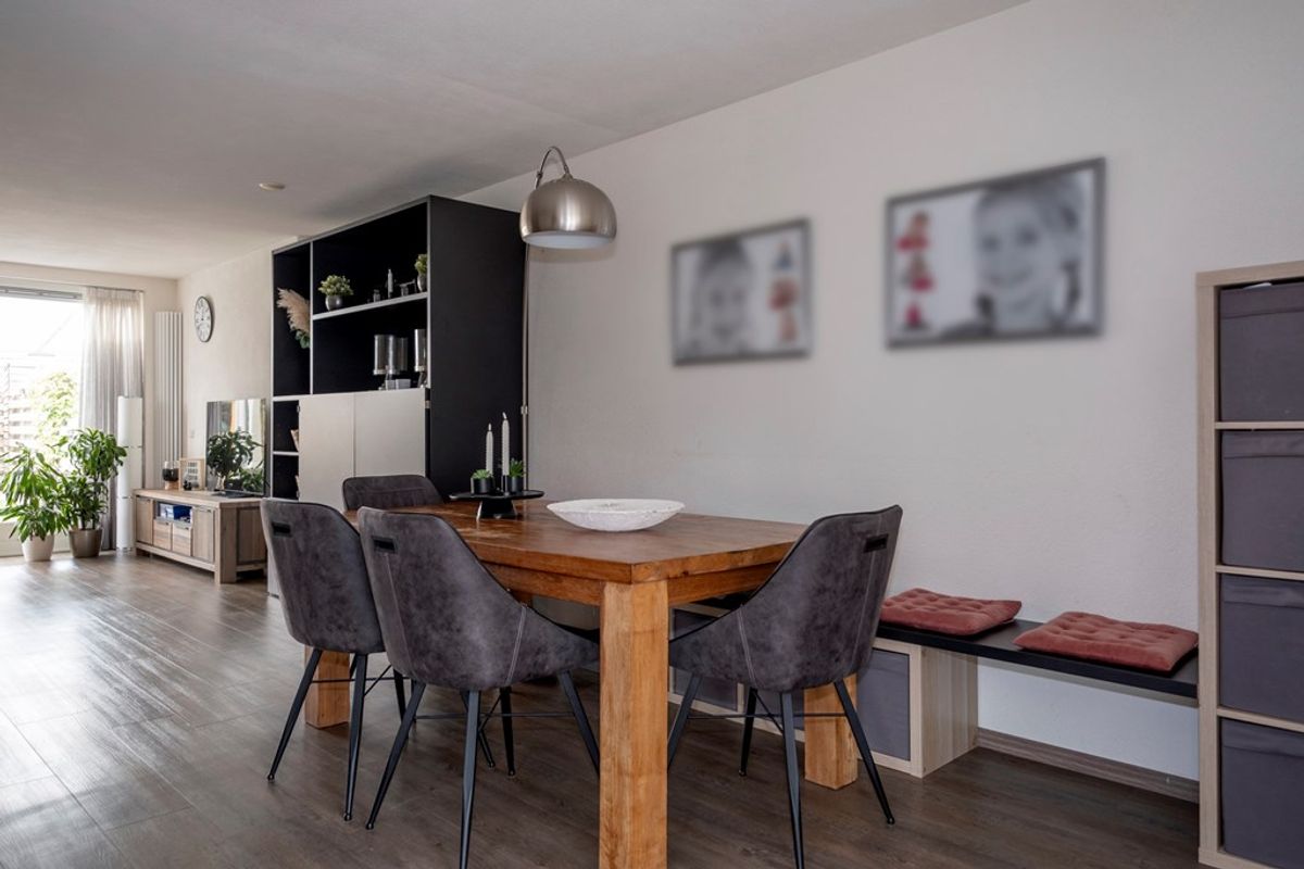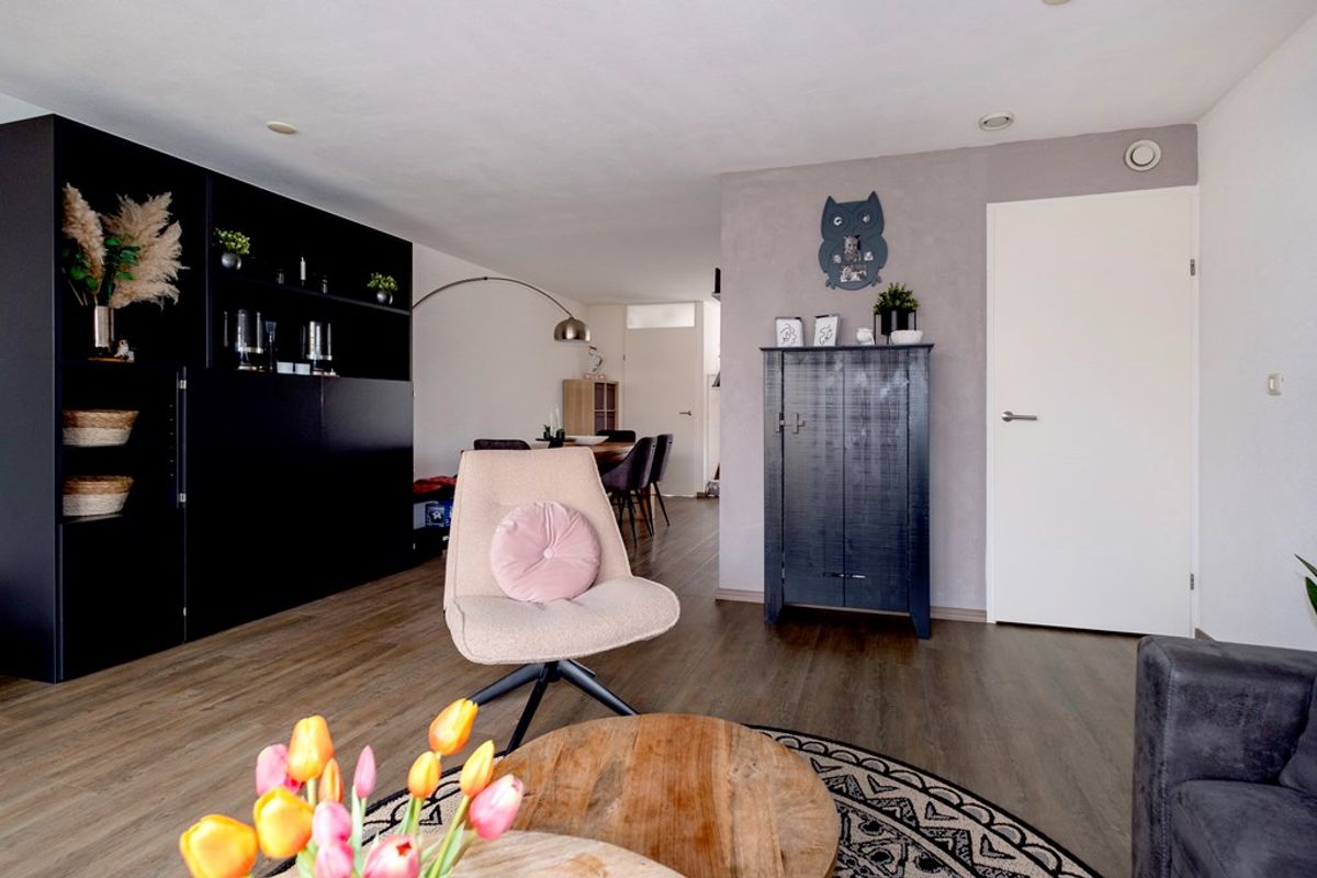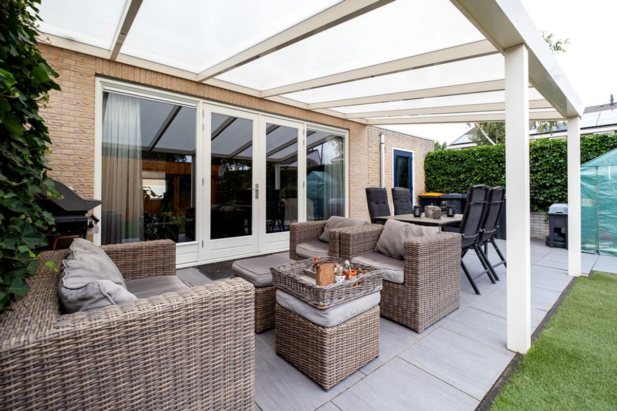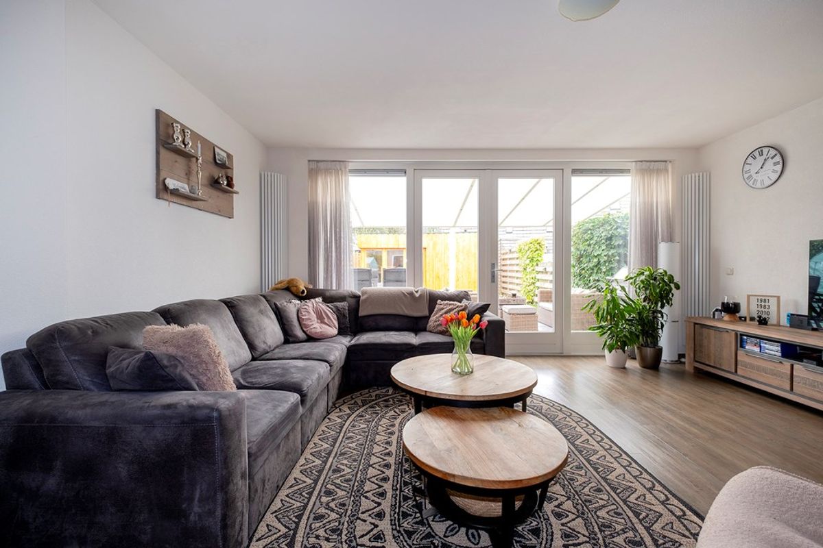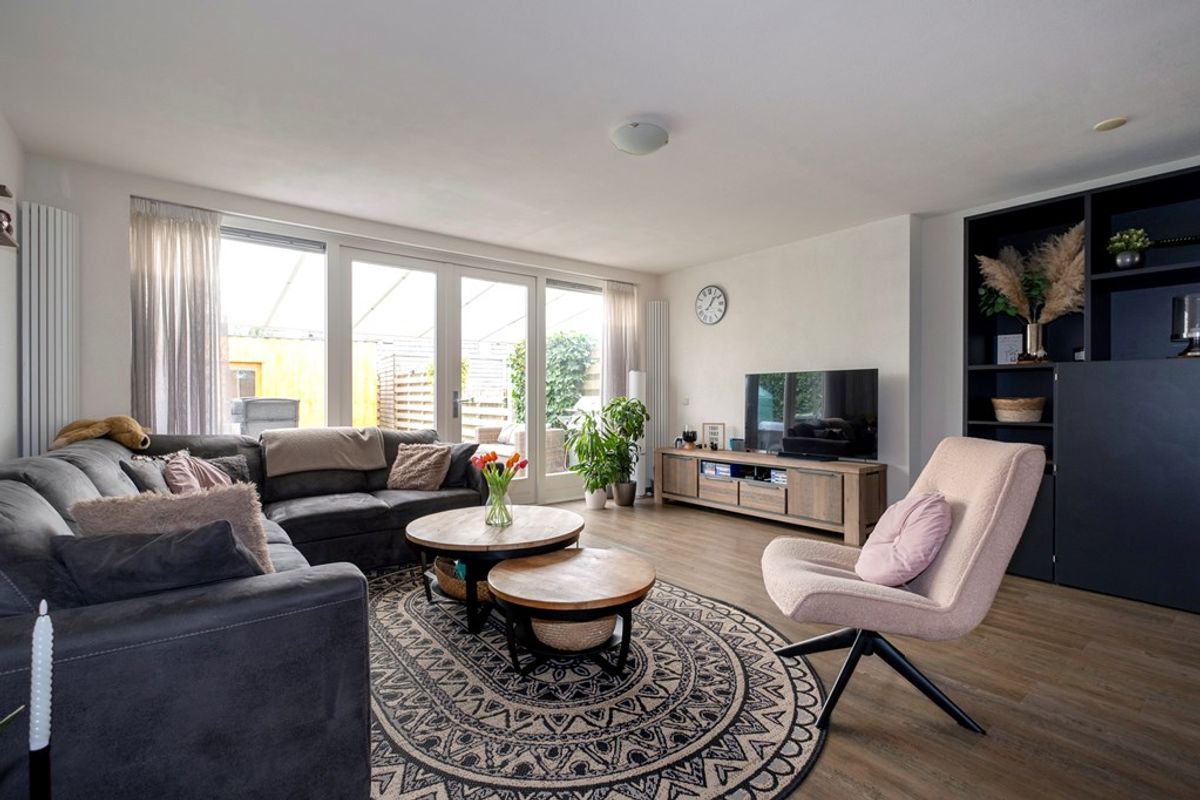 Bij binnenkomst valt de aan de tuinzijde gesitueerde woonkamer direct op. De grote raampartijen zorgen voor een overvloed aan natuurlijk licht en geven een prachtig uitzicht op de achtertuin, die voorzien is van een sfeervolle overkapping en een fraai tuinhuis. Dit is dé plek om te genieten van de buitenlucht, of het nu gaat om een gezellige barbecue met vrienden of een rustige middag met een boek.