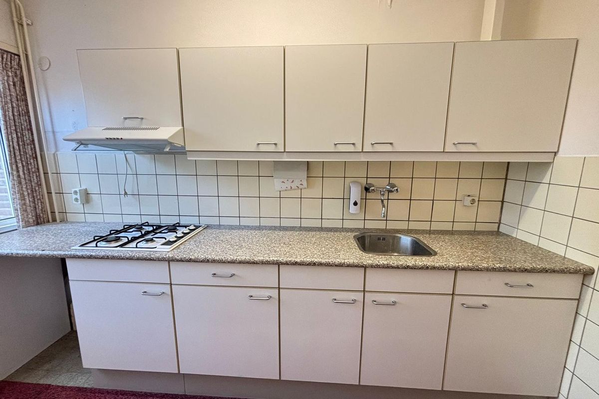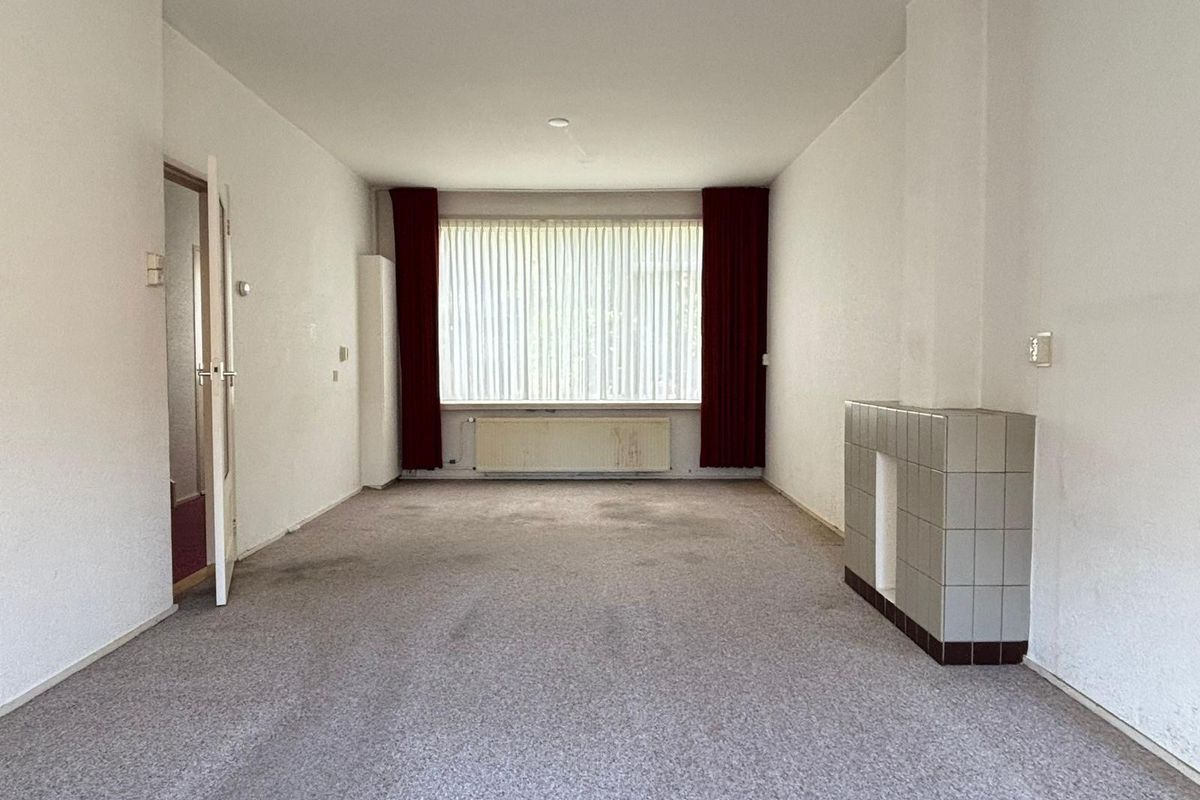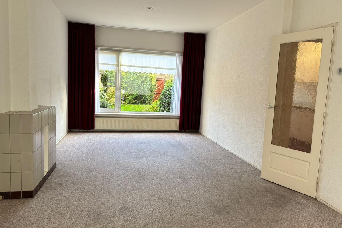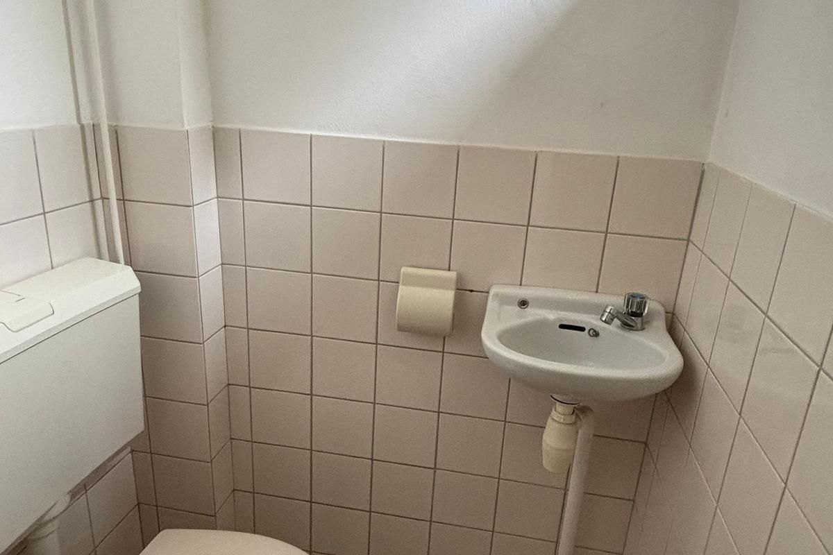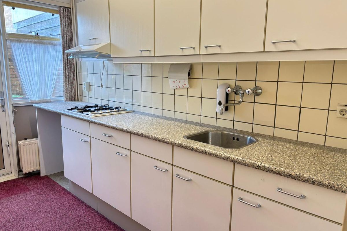 Begane grond: entree met trap naar de eerste verdieping, trapkast, meterkast en deels betegelde toiletruimte met toilet en fontein, dichte keuken met toegang tot de tuin, doorzon woonkamer.