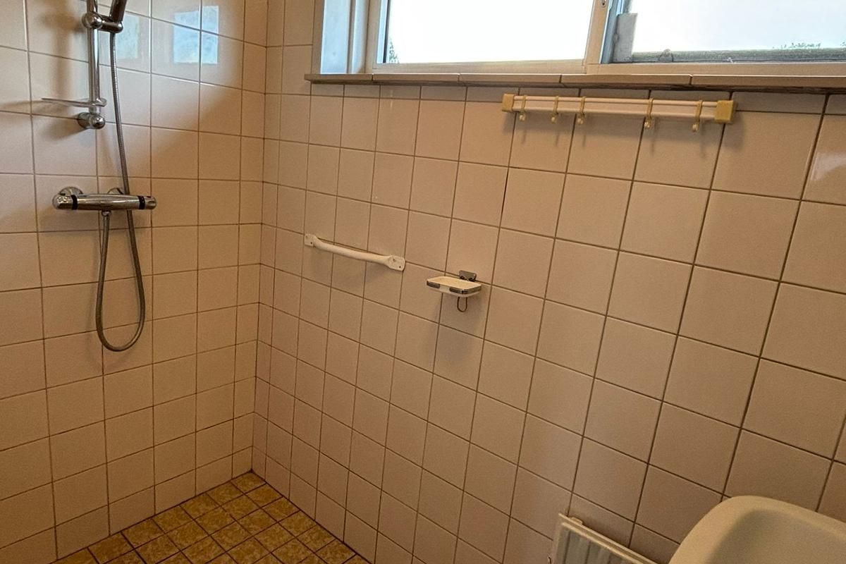 1e Verdieping: Overloop met zachtboard plafond, grotendeels betegelde badkamer met wastafel en douche, 3 slaapkamers met zachtboard plafonds.