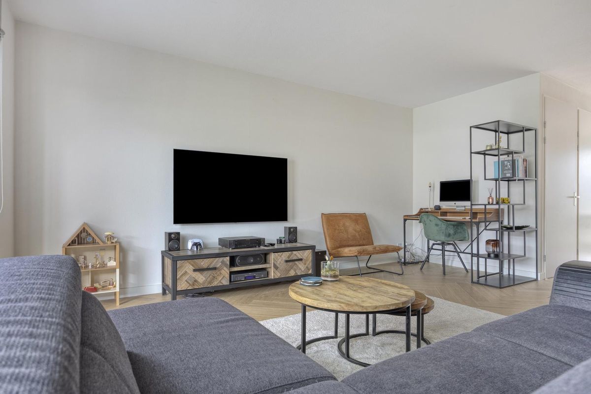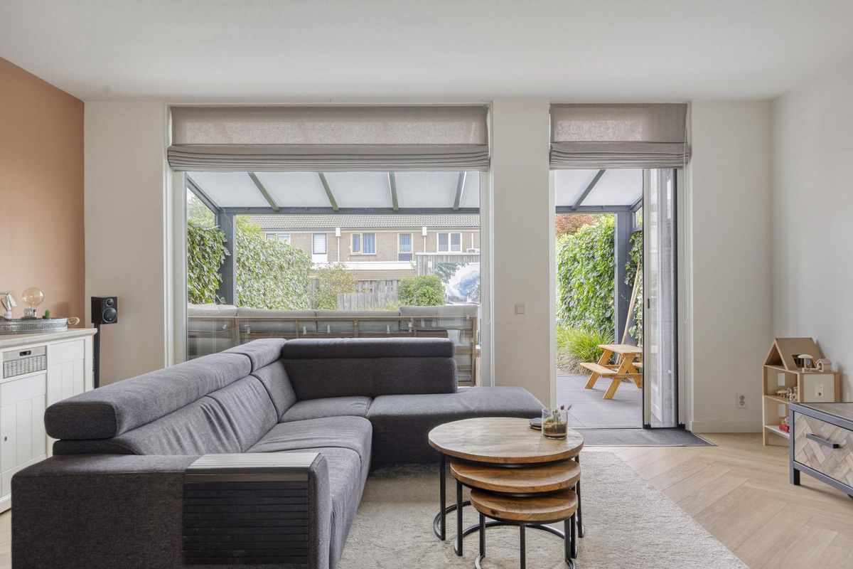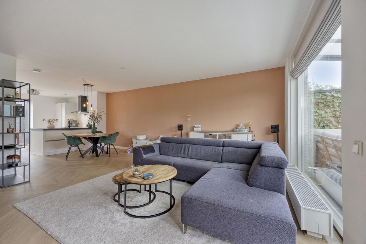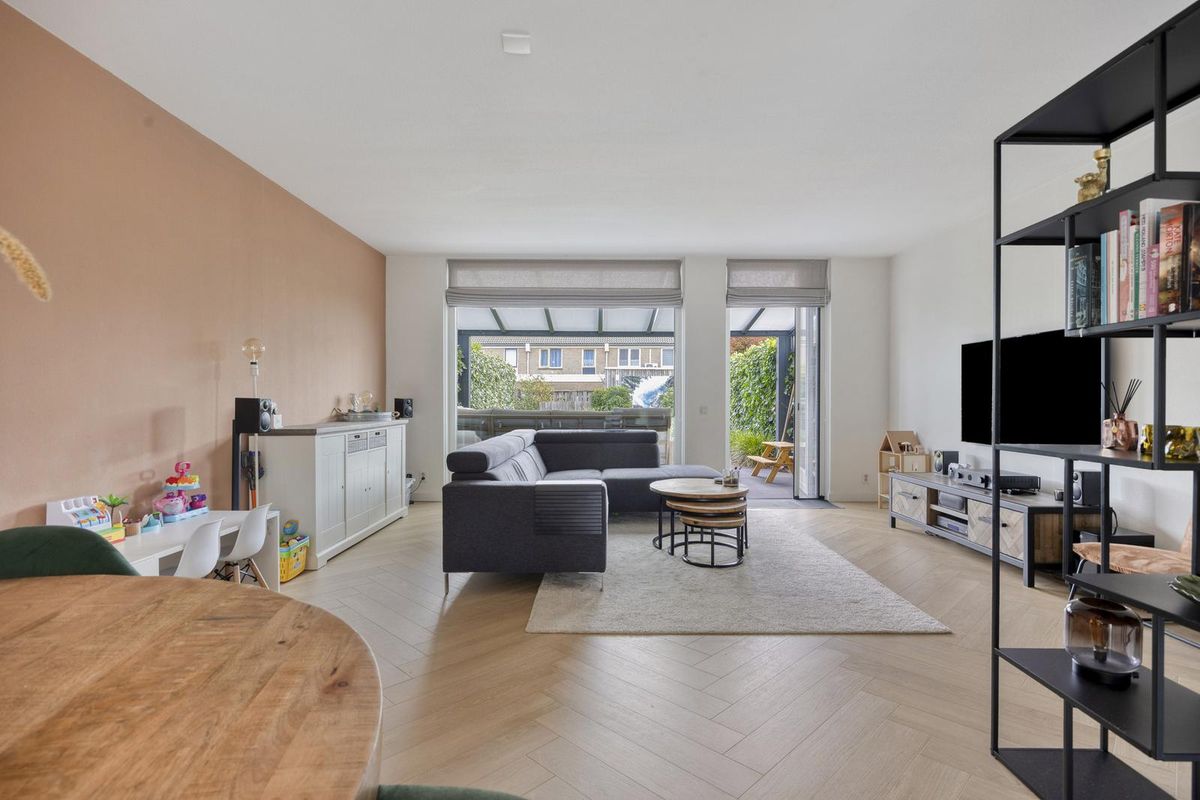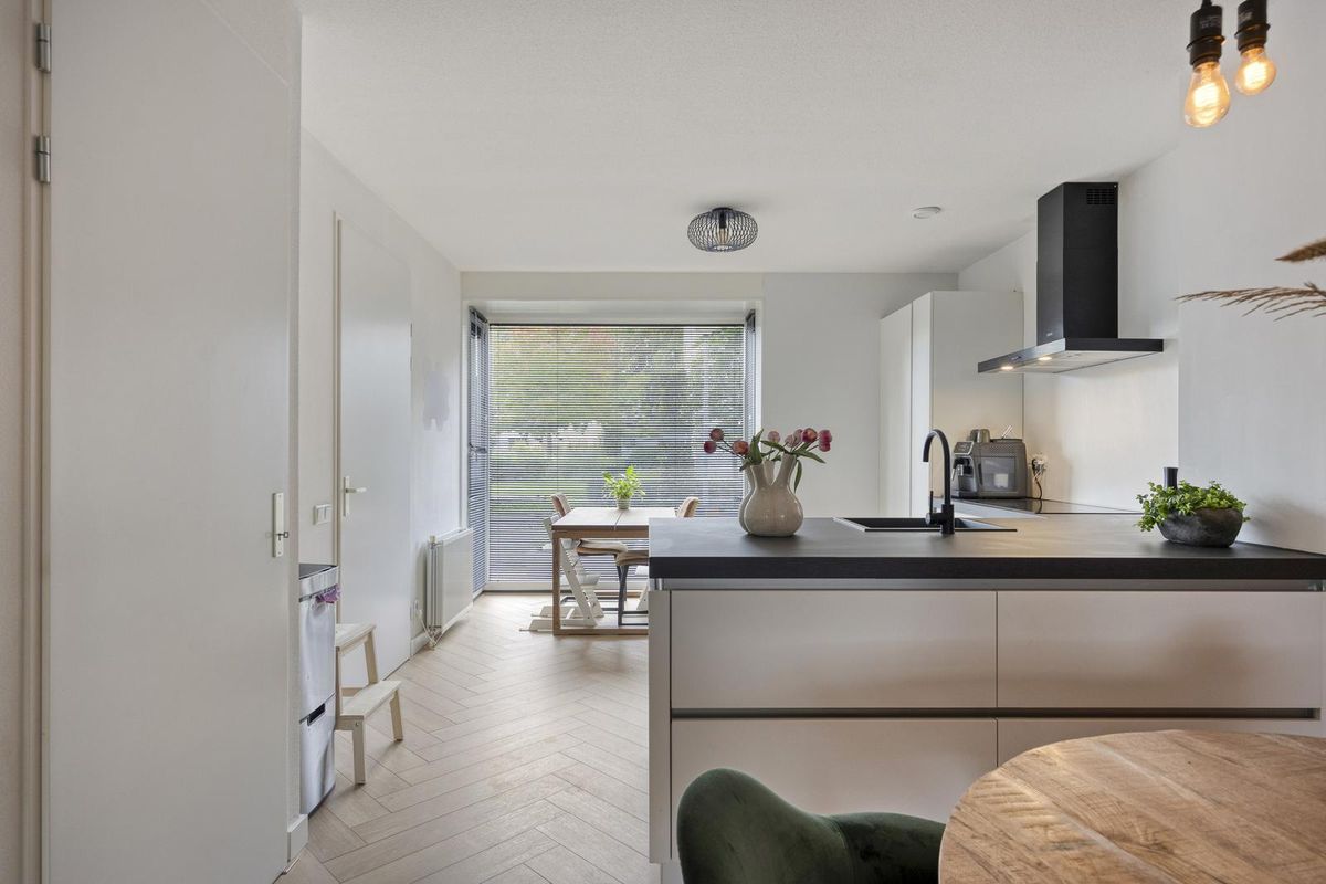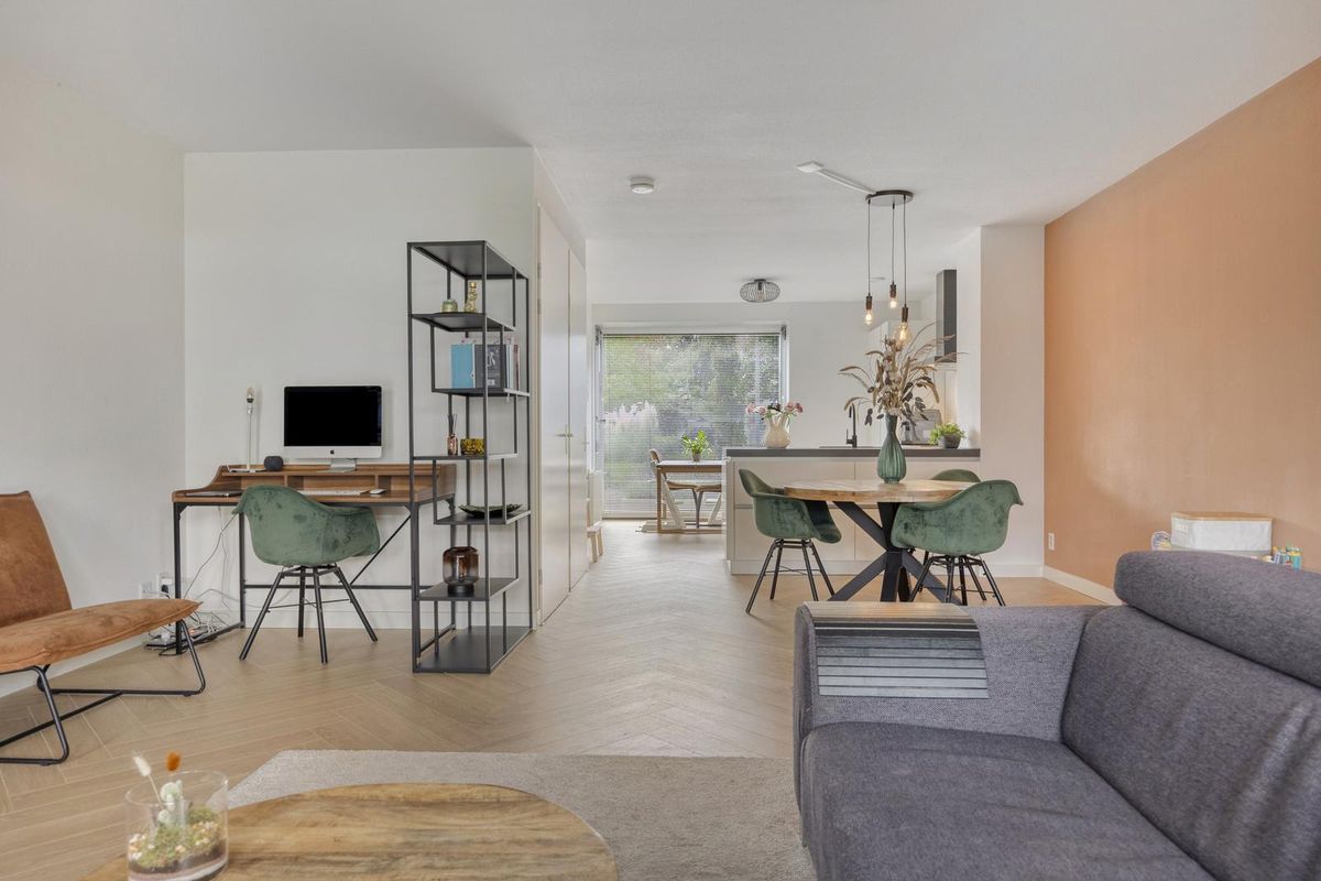 De woonkamer en keuken vormen samen een fijne open leefruimte, waar de grote ramen zorgen voor een overvloed aan natuurlijk licht. Door de L-vormige indeling kun je leuke hoekjes creëren, zoals een knusse zithoek of een leesplekje.