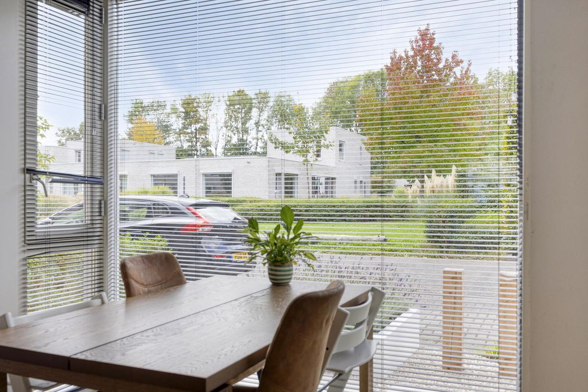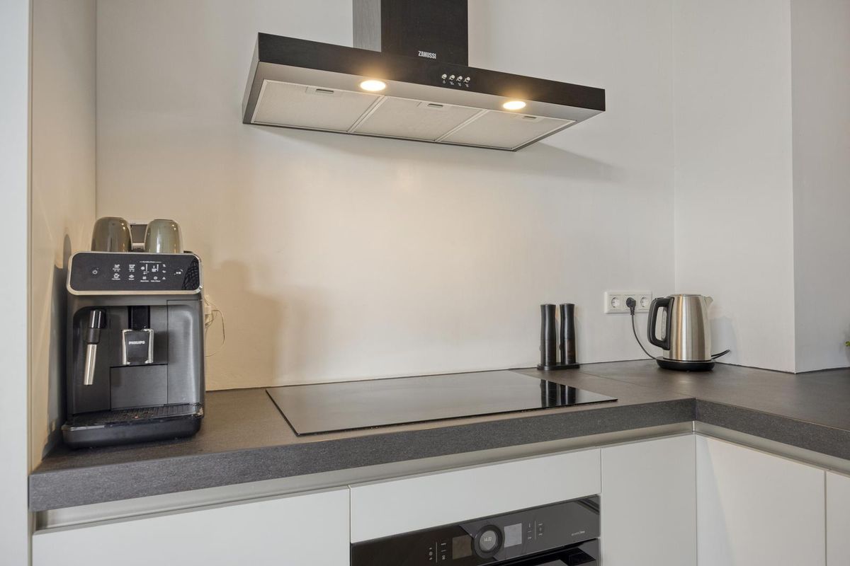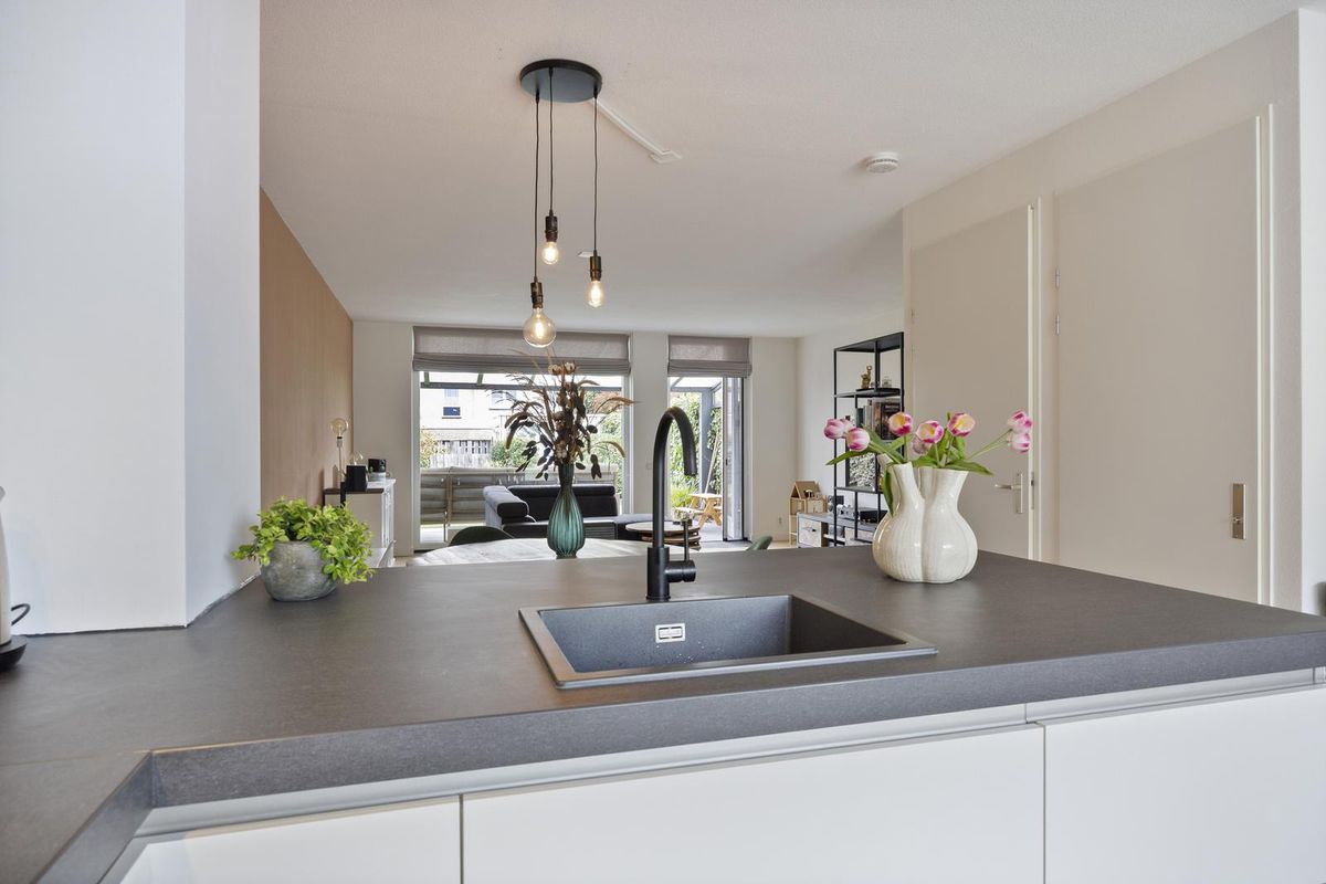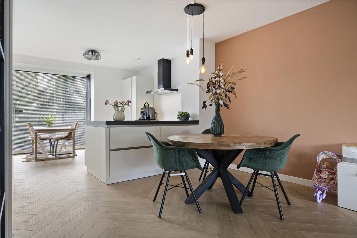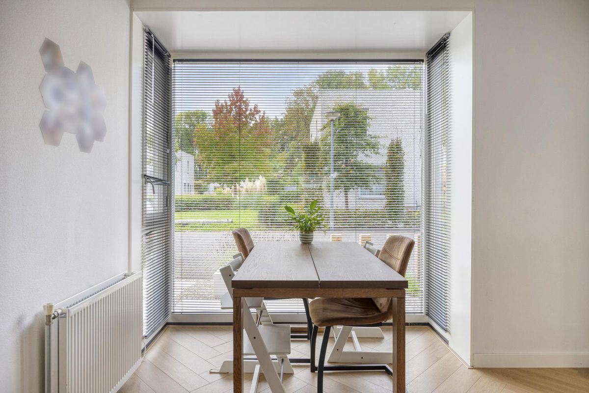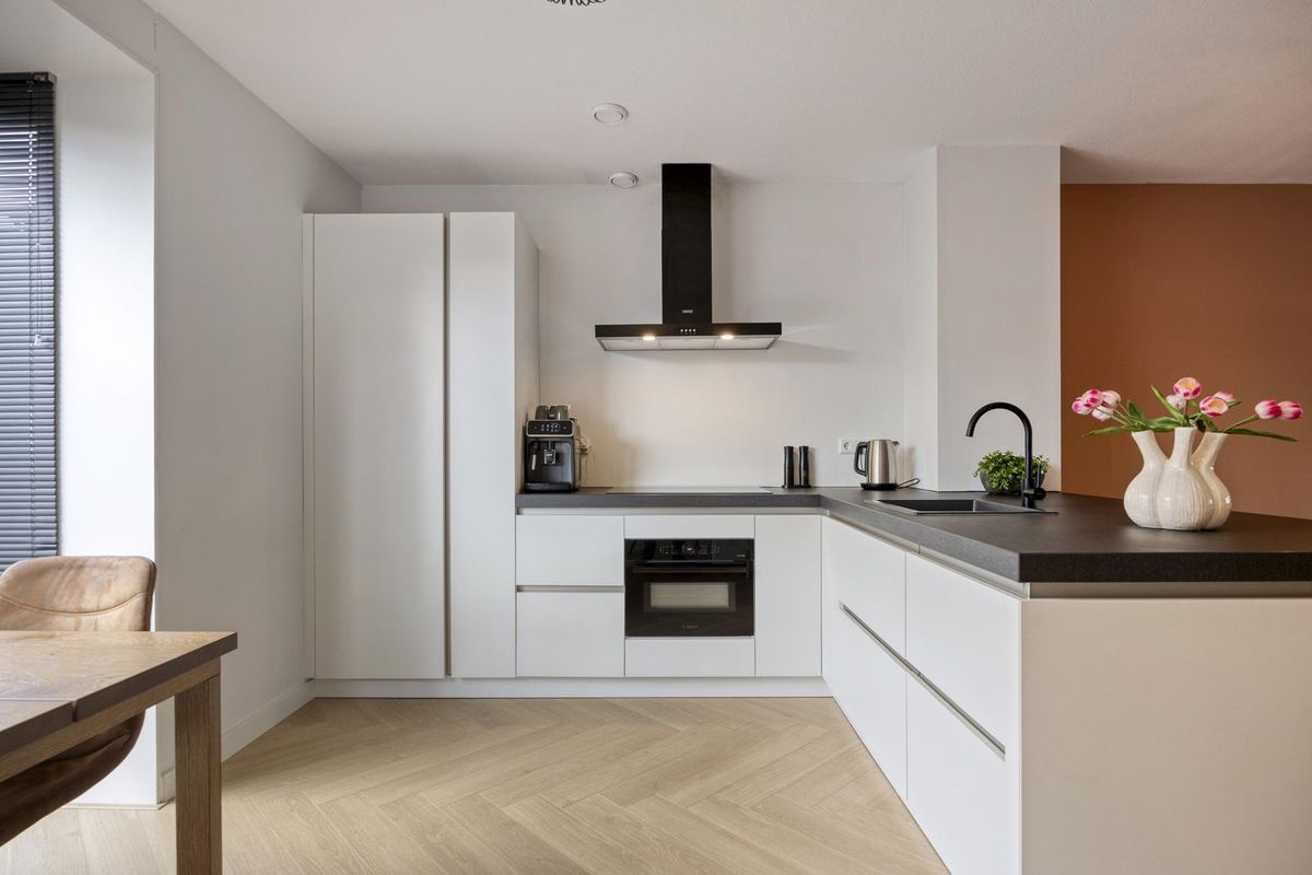 De open keuken bevindt zich in een eigen hoek en heeft een moderne uitstraling: witte kasten, een dik zwart keukenblad, zwarte details en een inductieplaat met strakke afzuigkap. De zwarte wasbak en oven maken het helemaal af. In de charmante erker met ramen van boven tot beneden is een gezellige eethoek gecreëerd – de perfecte plek om van je koffie of diner te genieten met uitzicht op de tuin.