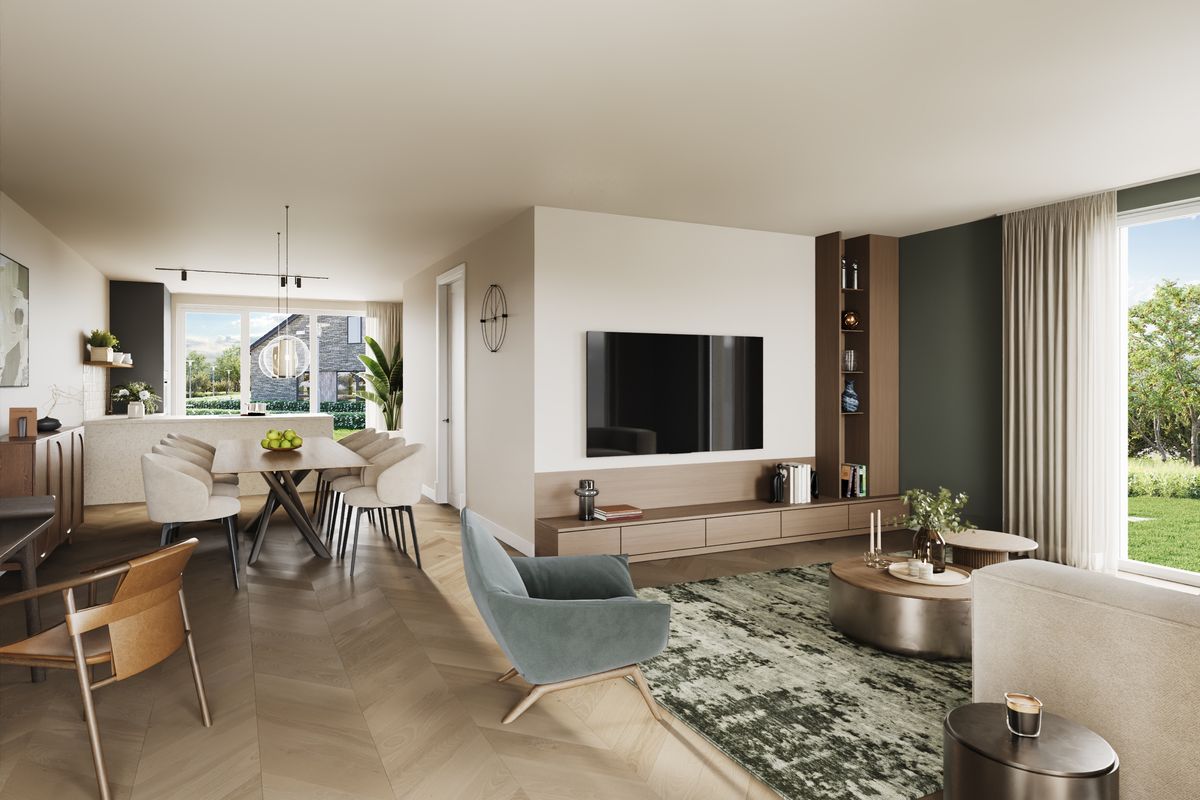 “De hoeve setting van Buitenplaats Warande is geïnspireerd op de omgeving” vertelt architect Michel van Soolingen van Houweling Architecten. “We wilden aansluiten op de lintbebouwing eromheen en op de hoeve aan de overkant van de weg. Zo werd een hedendaags ontwerp met een landelijke uitstraling ons uitgangspunt. Een duurzaam ontwerp waarin we gebruikmaken van veel natuurlijke materialen. Dit ziet u terug in de houten zonwering, de klimbeplanting voor privacy en hittewering, waar mogelijk open bestrating en zowel nestkasten als streekeigen beplanting om de biodiversiteit te versterken.” Ook de ruimte op Buitenplaats Warande past bij landelijk wonen. “De woningen zijn groot en hebben een heerlijke tuin” vertelt Michel. “In combinatie met de boomgaard,de autoluwe straten en het water, ontstaat hier een vakantiegevoel. Het biophillic design principe, waarmee we buiten als het ware naar binnen trekken, maakt dat u straks ook in de woonkamer en keuken de verbinding voelt met uw omgeving. Daar kunt u in uw interieurontwerp op aansluiten, bijvoorbeeld met planten en houten