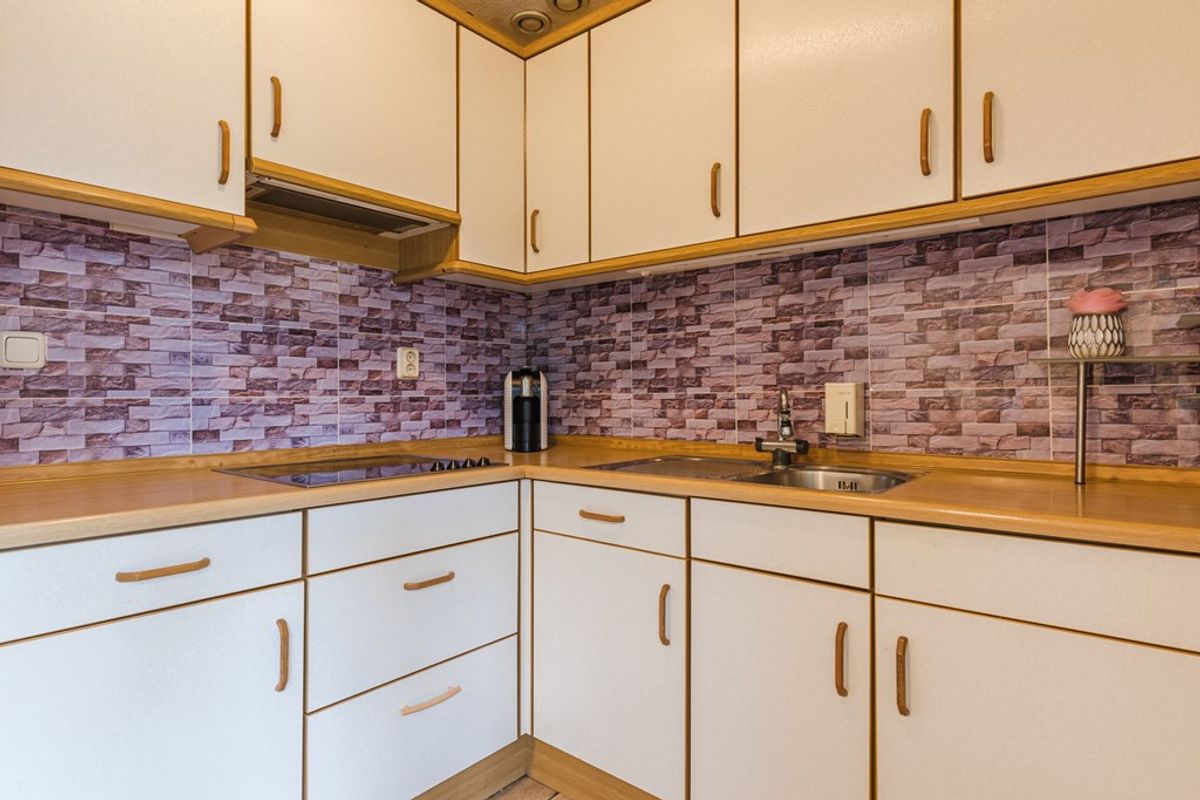 De doorzon woonkamer met open keuken (totaal ca. 34 m²) is licht en functioneel ingedeeld. De keuken is eenvoudig uitgevoerd en voorzien van een inductiekookplaat, afzuigkap en koelkast.