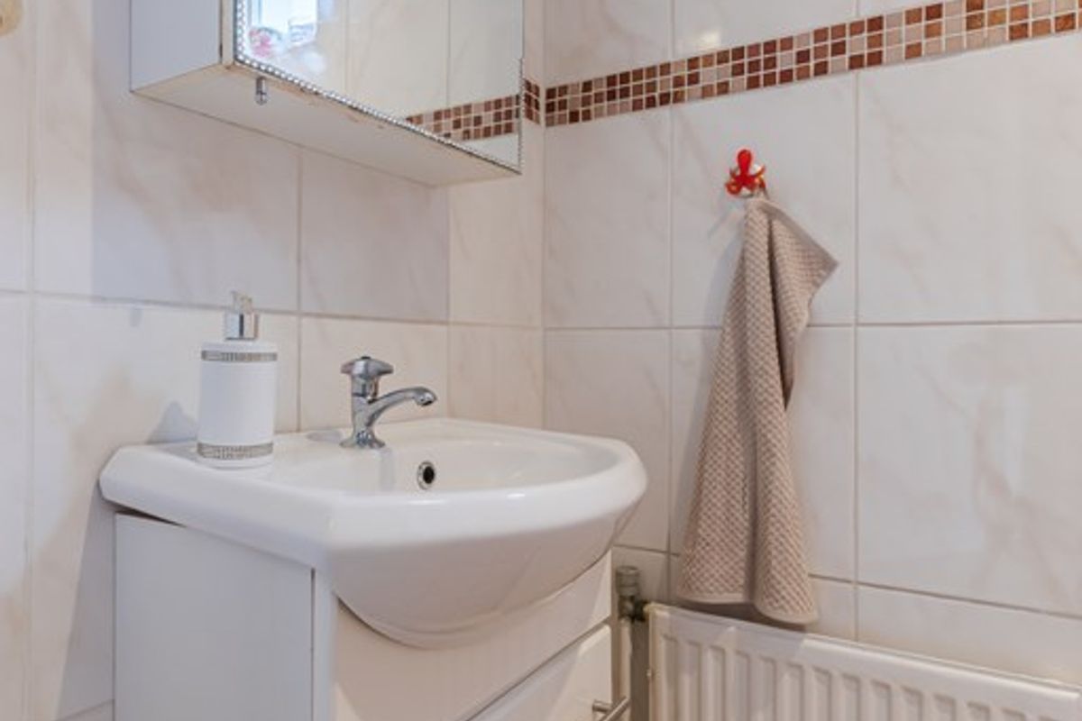 De begane grond is voorzien van een tegelvloer en heeft een praktische, ruime indeling. Vanuit de hal (ca. 3 m²) zijn het toilet met fonteintje en de woonkamer bereikbaar.