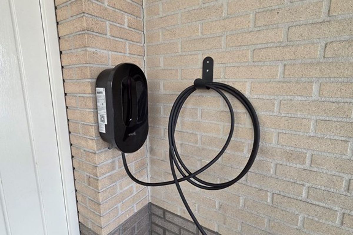 Deze oprit is voorzien van een carport en een oplader voor een elektrische auto.