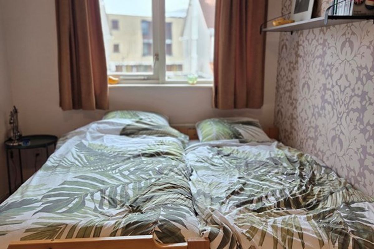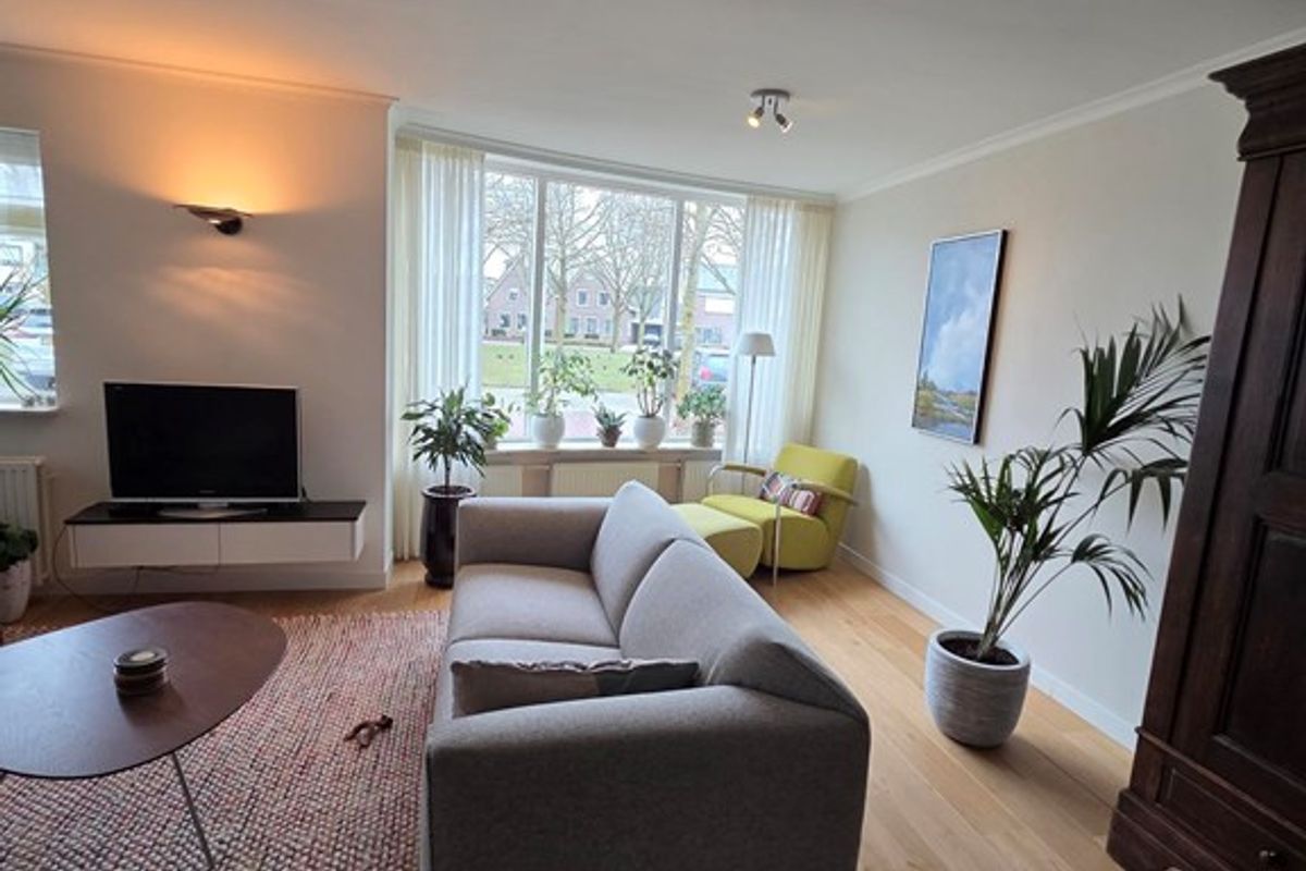 De woning beschikt over een ruime en lichte woonkamer met een sfeervolle erker aan de voorzijde, wat zorgt voor extra lichtinval en een ruimtelijk gevoel.