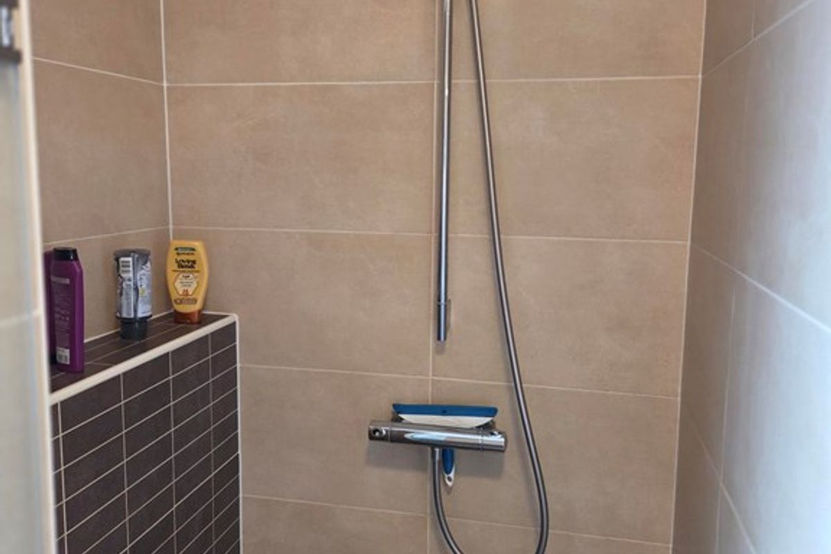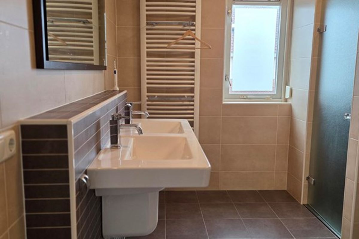 De badkamer is royaal en uitgerust met een douche, toilet en mooi wastafelmeubel en extra grote kast.