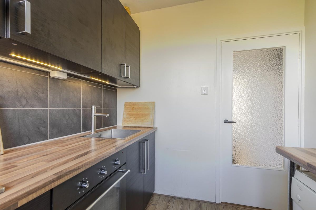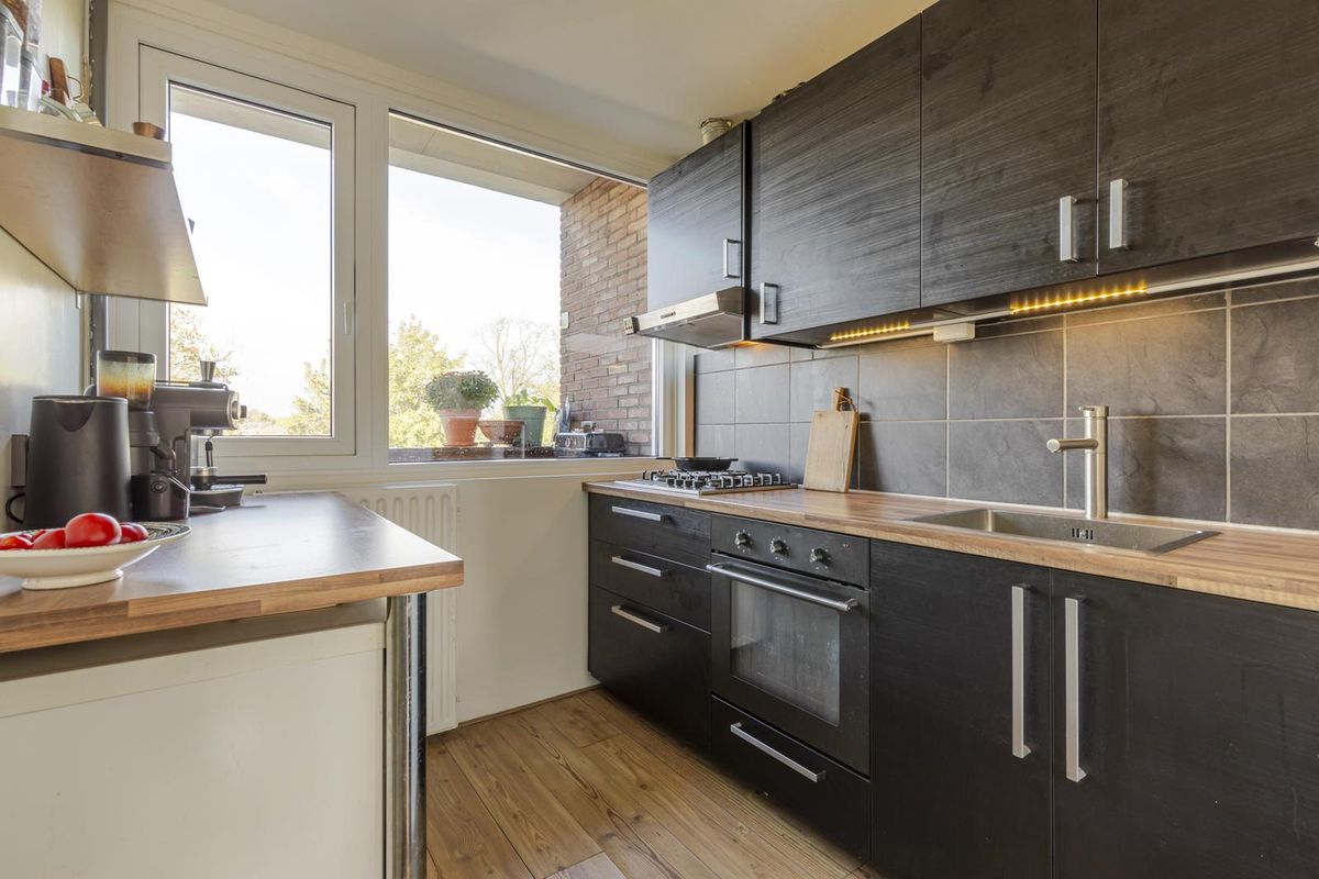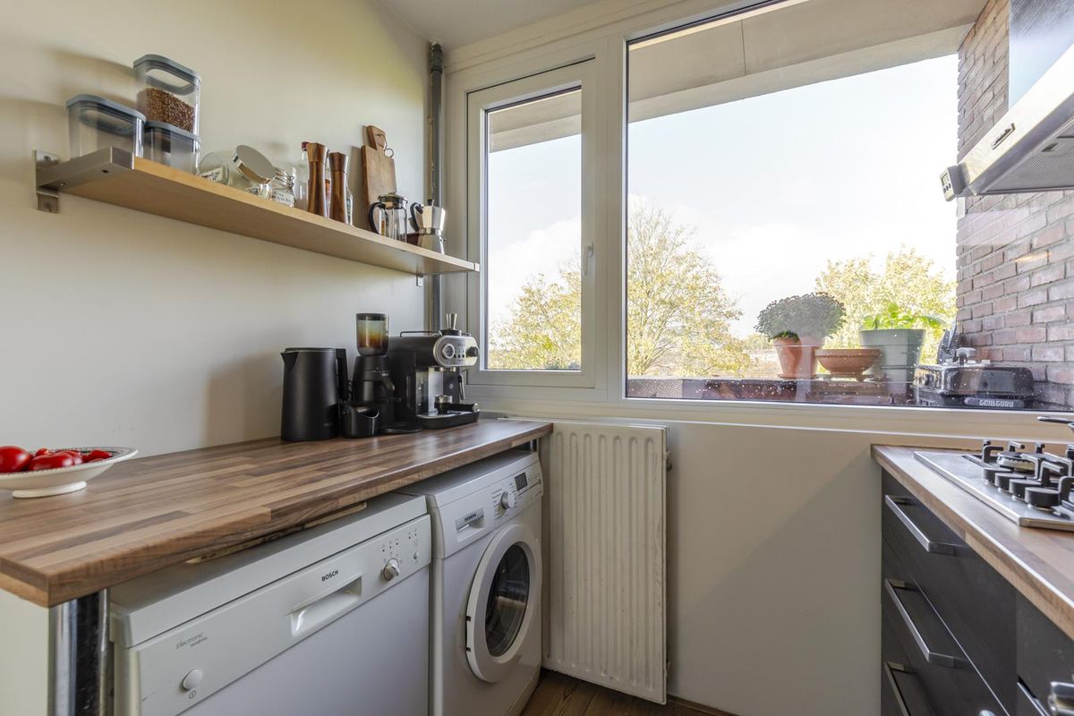 Hal/entree, de hal maakt direct een prettige indruk door het glas-in-lood detail richting de woonkamer. De woonkamer is ruim en heerlijk licht dankzij de grote raampartijen met vrij uitzicht over de groene Plesmanlaan. De kamer is sfeervol afgewerkt met een lichte laminaatvloer en neutrale wanden, en biedt toegang tot het zonnige balkon op het zuidoosten. Aan de voorzijde bevindt zich de royale eetkamer. Dankzij de grote ramen en het uitzicht over de groene binnentuinen is dit een fijne plek om te eten, werken of ontspannen. De moderne keuken is uitgerust met diverse inbouwapparatuur, waaronder een 4-pits gaskookplaat, oven, afzuigkap, vaatwasser en spoelbak. Ook is er ruimte voor de wasmachine en koelkast. Vanuit de keuken heb je toegang tot het balkon aan de voorzijde voor een diner buiten in de avondzon. De badkamer is modern afgewerkt met grijze wandtegels en voorzien van een douchecabine, wastafel en toilet.