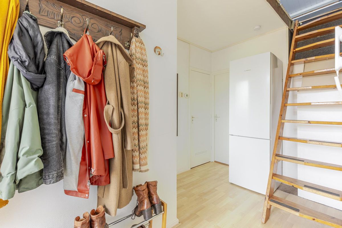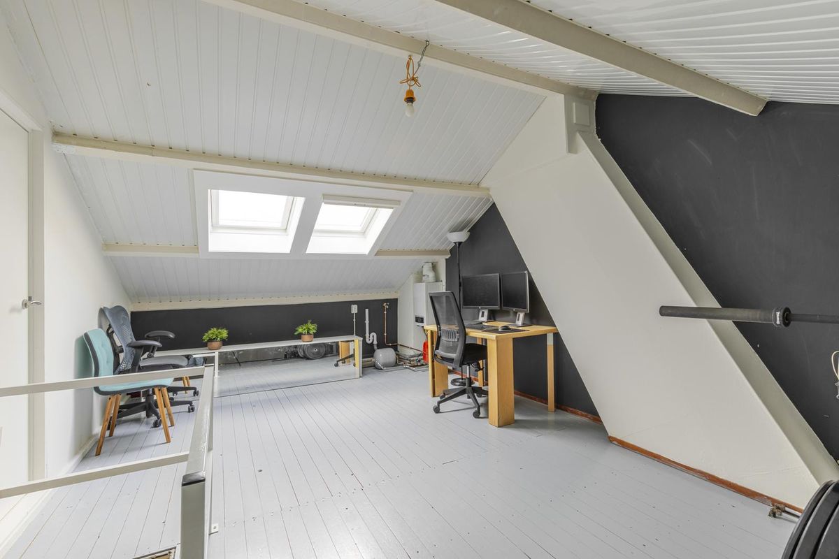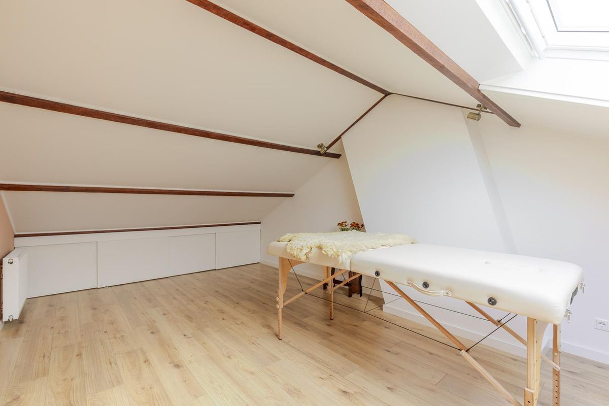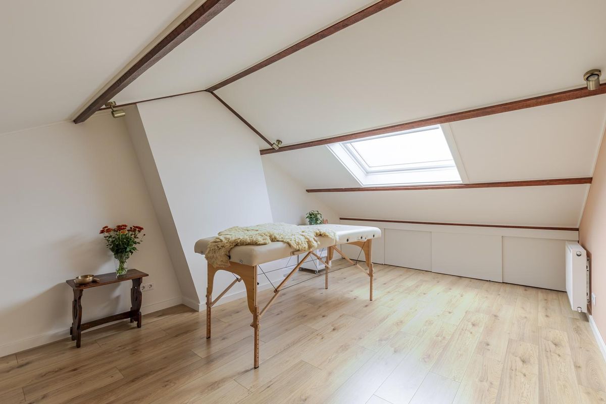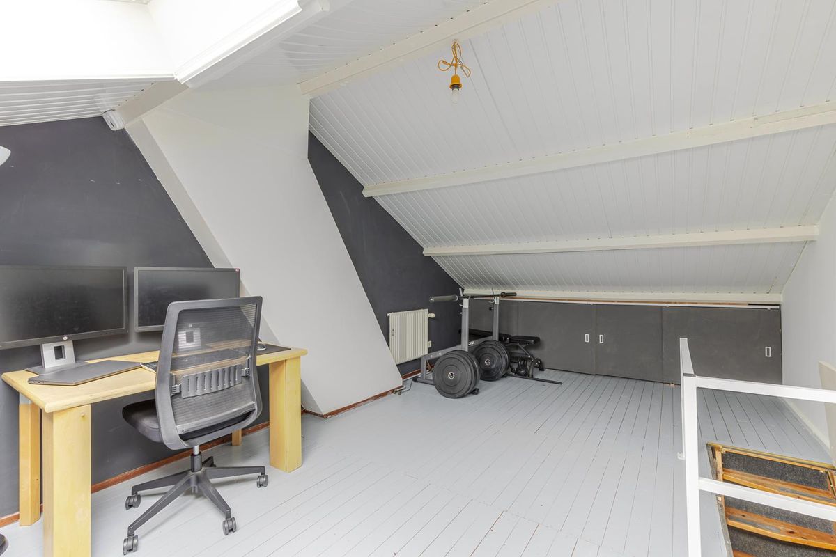 Via een vaste houten trap in de hal bereik je de ruime bovenste verdieping met dakramen, veel bergruimte en een praktische wasmachineaansluiting. De verdieping is verdeeld in twee kamers en wordt nu gebruikt als werkruimte, logeerkamer en fitnessruimte. Dankzij de afmetingen en hoogte biedt de zolder volop mogelijkheden; bijvoorbeeld voor een extra slaapkamer, hobbyruimte of kantoor aan huis.