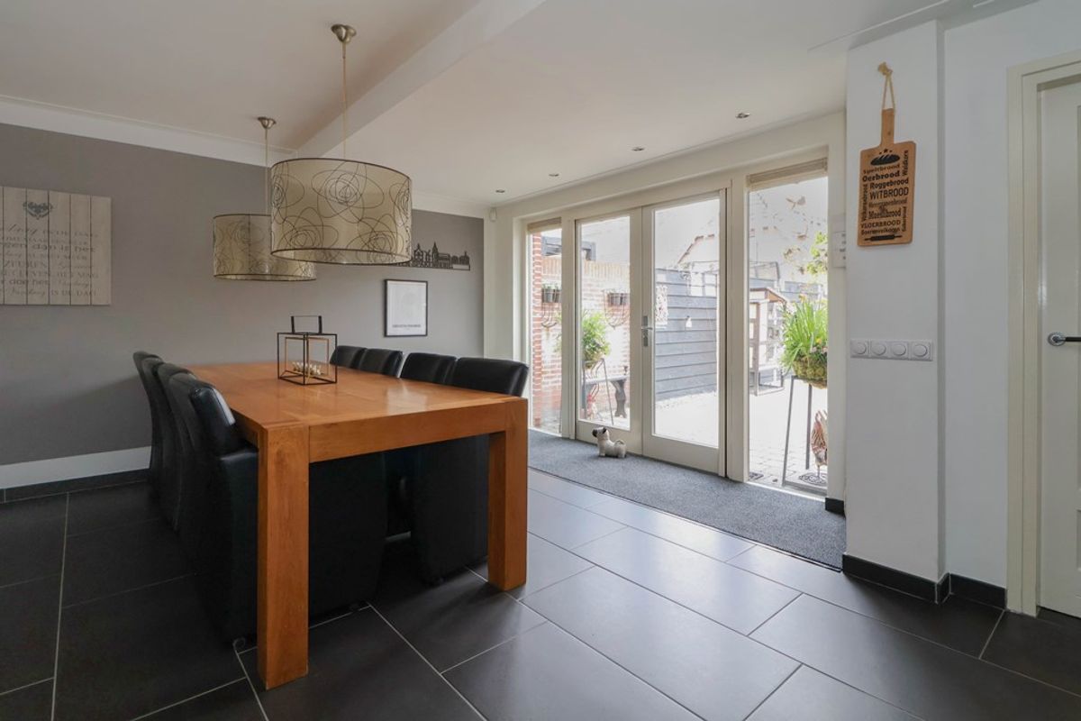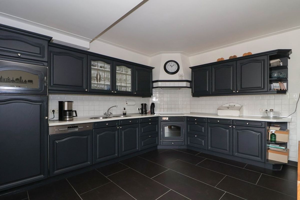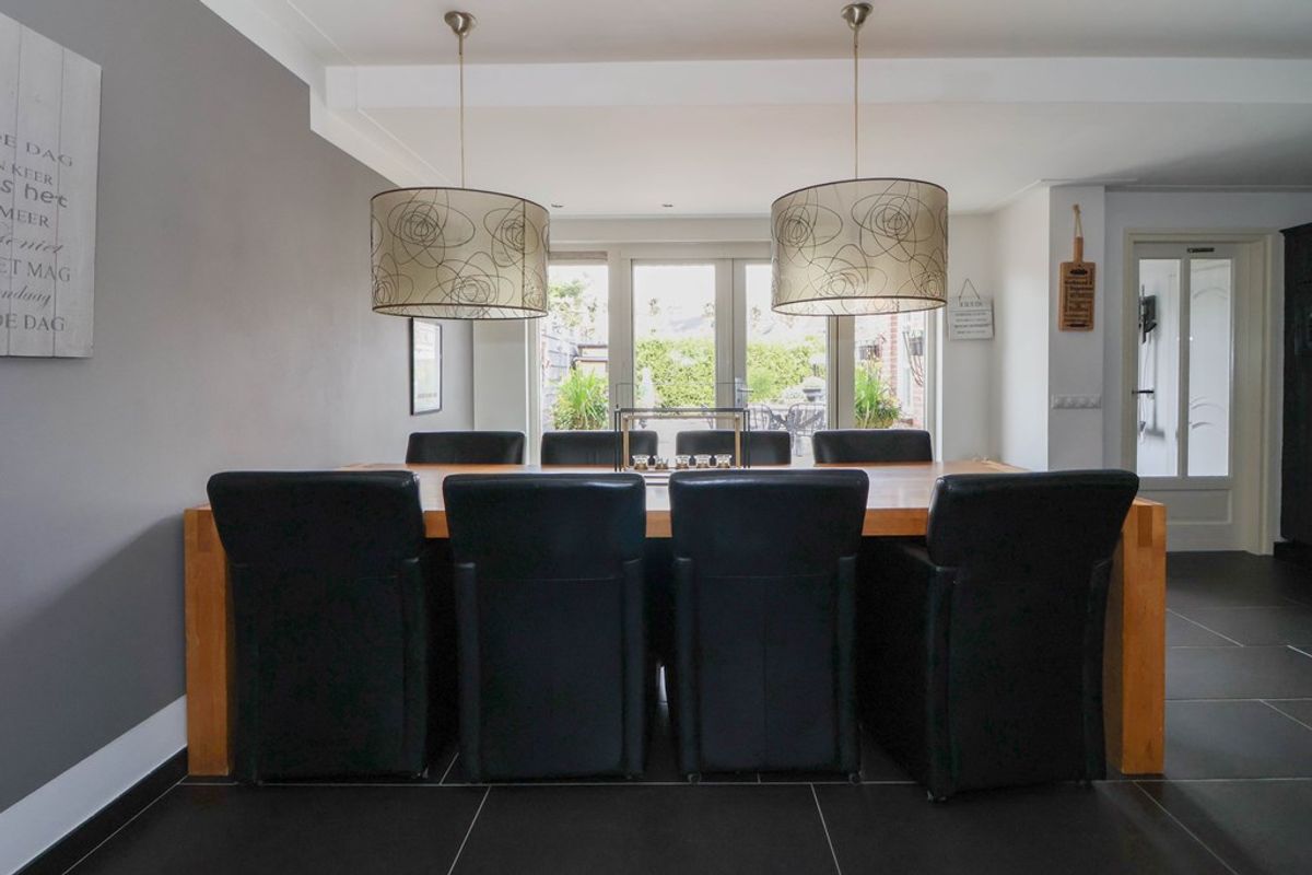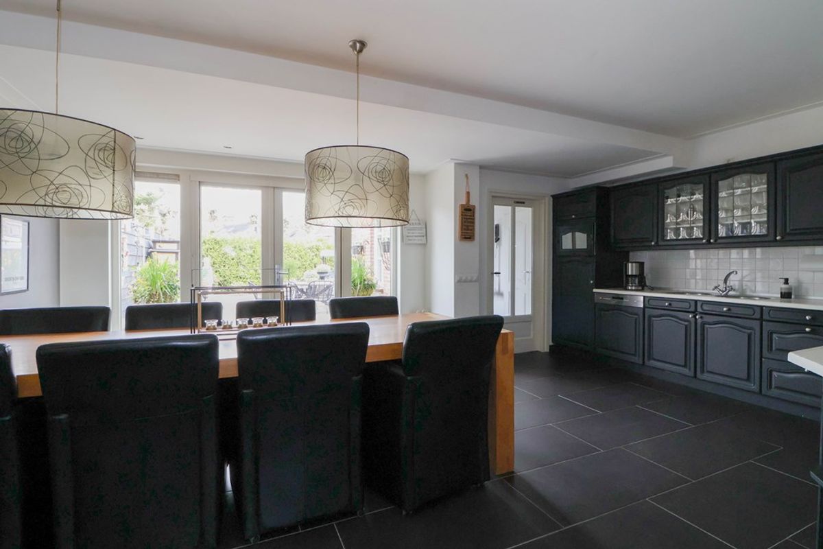Woonkeuken met openslaande deuren naar de tuin. Keuken voorzien van diverse inbouwapparatuur.