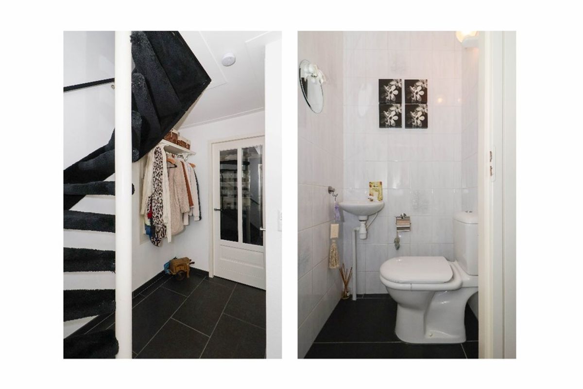 Hal met toilet, trapopgang naar de verdieping en toegang tot de woonkamer.