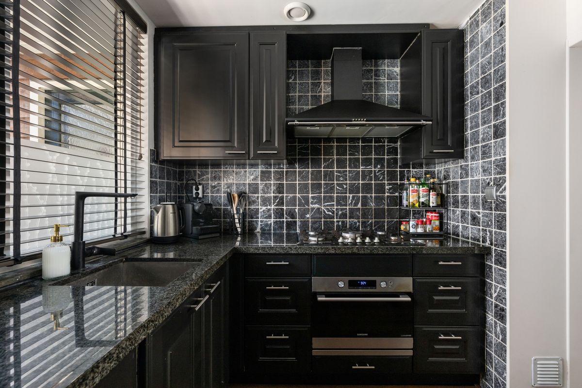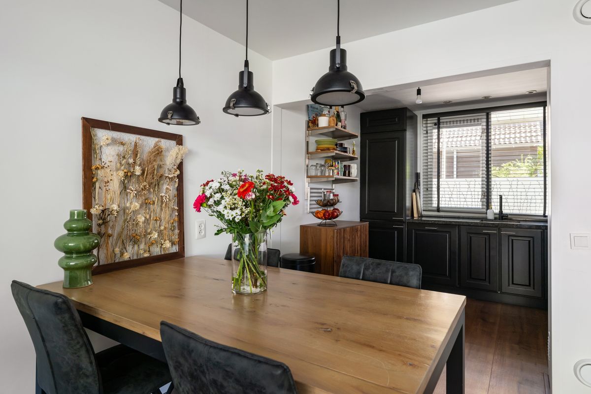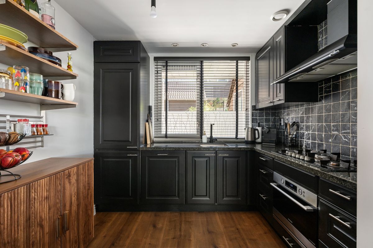 Open keuken (ca. 2.50 x 2.70m) gelegen aan de voorzijde van het huis. De bestaande keuken (uit 2010) heeft een moderne uitstraling gekregen doordat deze zwart is geschilderd. Granieten aanrechtblad. Inbouwapparatuur: gaskookplaat (5 pits), afzuigsysteem, combioven, koelvrieskast en vaatwasser.