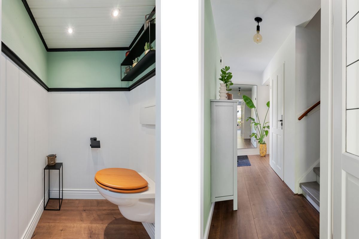 Entree, ruime hal met handige garderobekast, modern toilet en trap naar de verdieping.