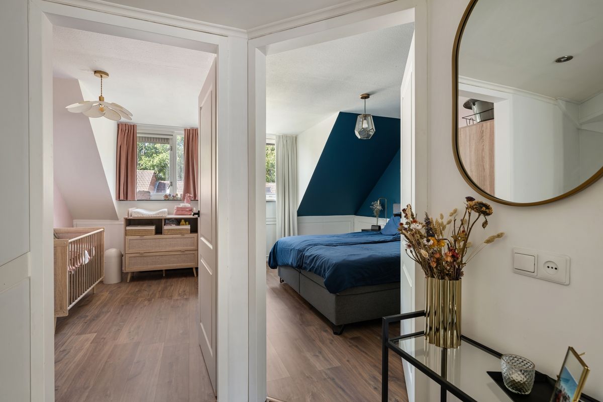 Op de overloop en in de slaapkamers ligt een moderne laminaatvloer.