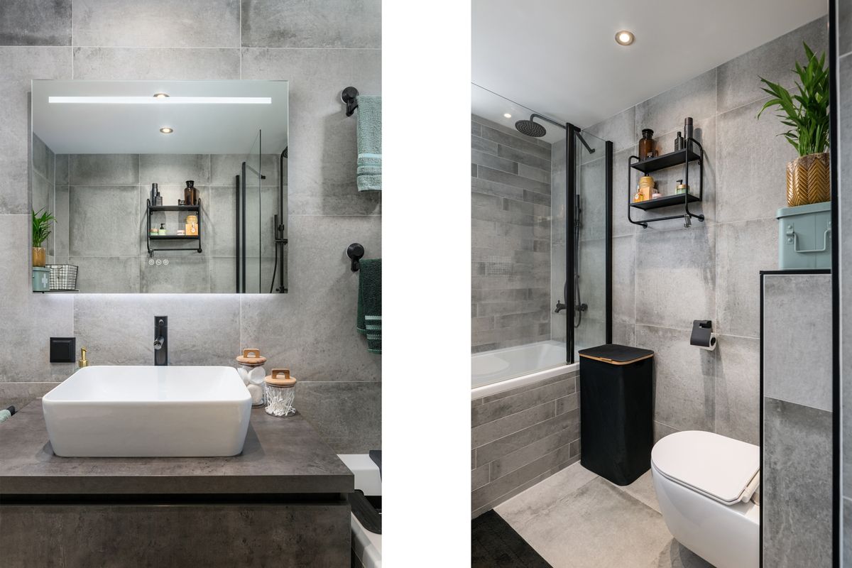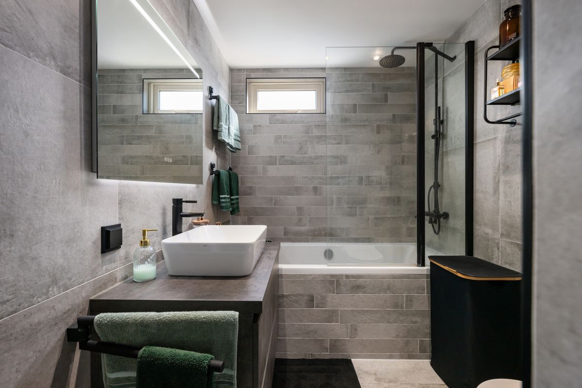 Mooi en luxe uitgevoerde badkamer uit 2019 (ca. 2.44 x 1.87m) met ligbad v.v. douchegedeelte, wastafelmeubel en toilet.
