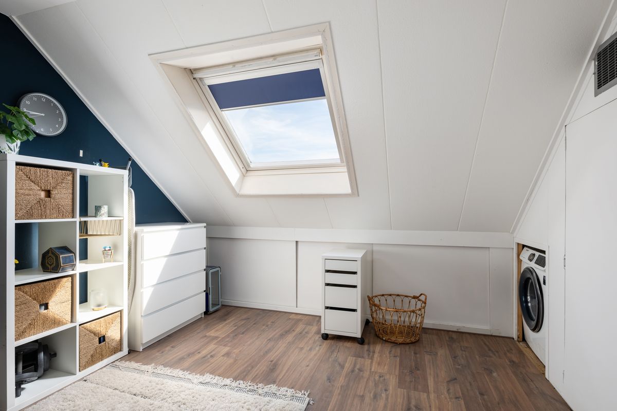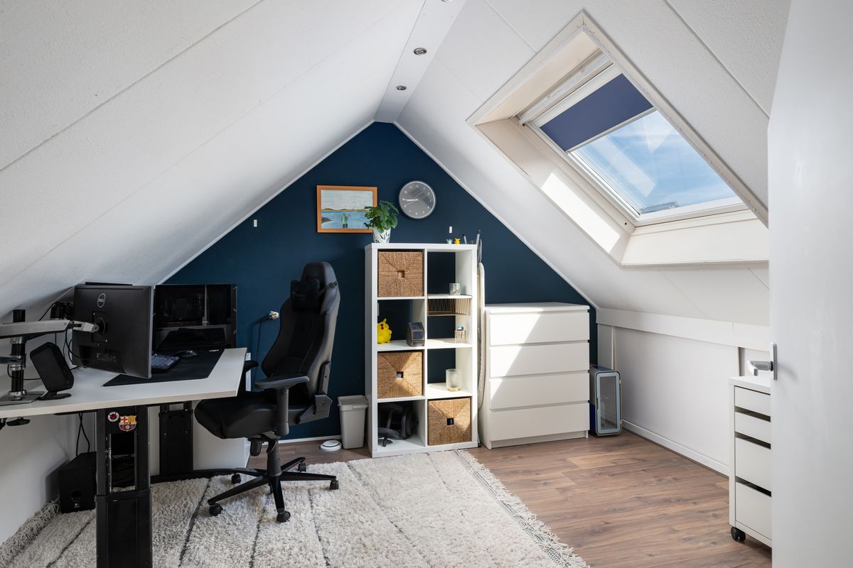 Knusse zolderkamer / werkplek met groot Velux dakraam. Bergruimte onder het schuine dak.