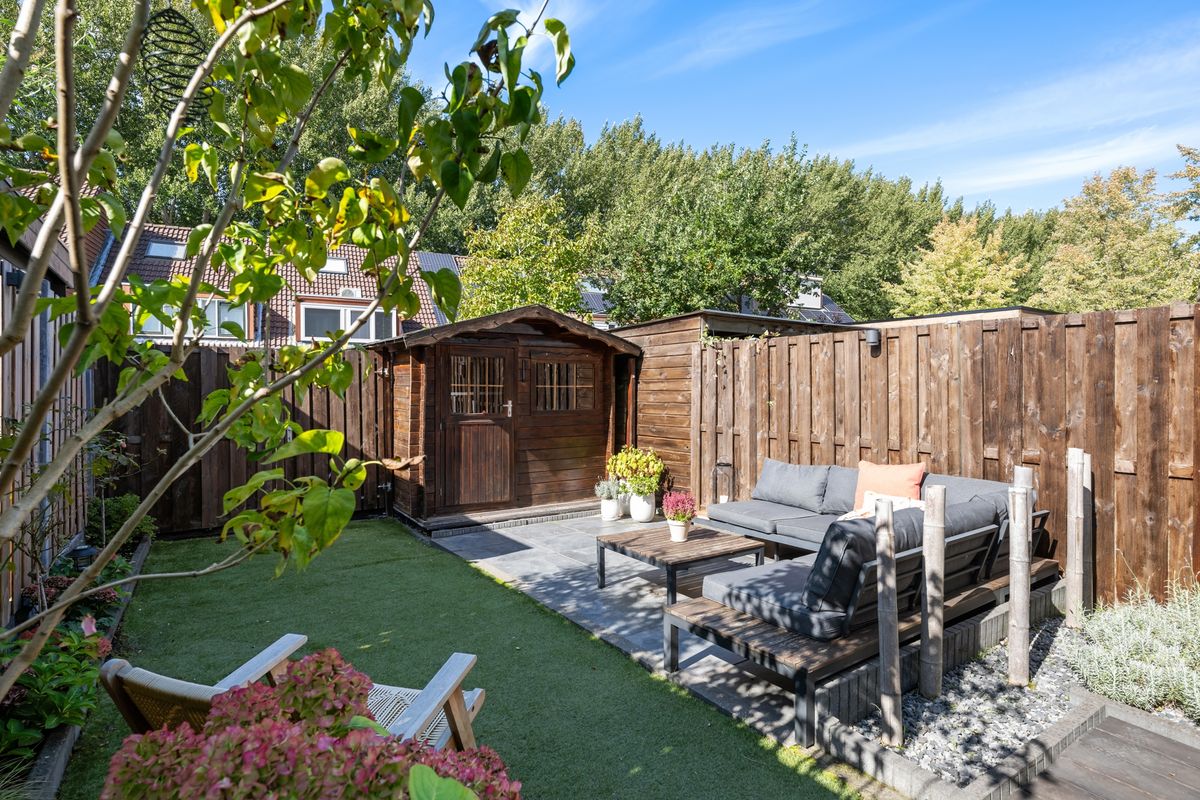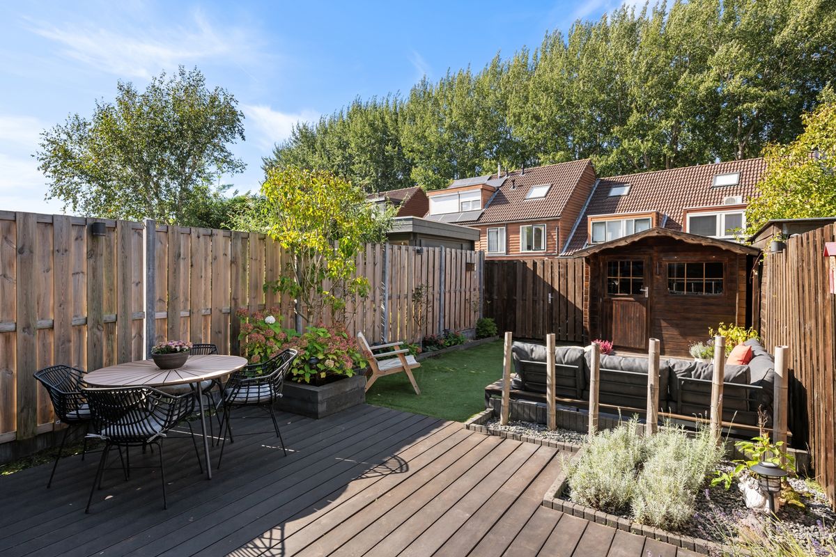 Vanuit de woonkamer is er trapje naar de iets lager gelegen achtertuin. De tuin is circa 10.85 meter lang en 5.00 meter breed en is gesitueerd op het noordwesten. Je kunt hier heerlijk van de zon genieten. De tuin is ingericht met een mooi vlonderterras, een gedeelte kunstgras en een betegeld terras. Achter in de tuin is een éxtra houten berging. Zonwering aan de achtergevel. Deur naar achterpad.