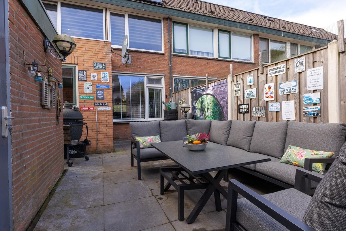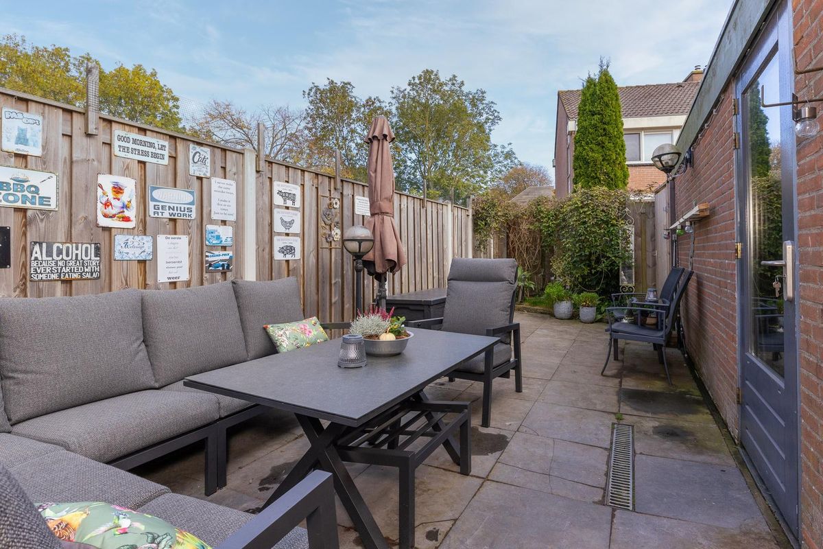 De tuingerichte woonkamer biedt veel privacy en een warme, huiselijke sfeer. De grote raampartij zorgt voor een fijne lichtinval en een mooie verbinding met de onderhoudsvriendelijke achtertuin, bereikbaar via de aangebouwde bijkeuken.