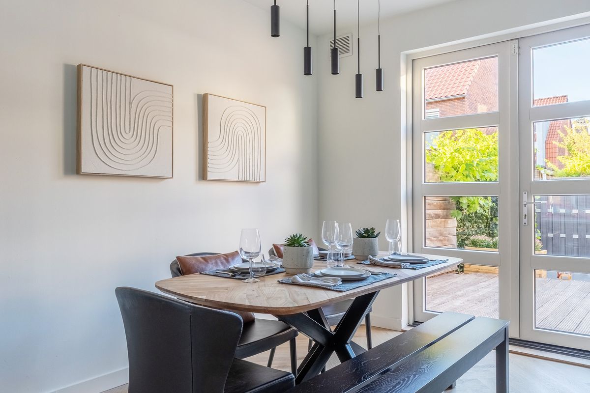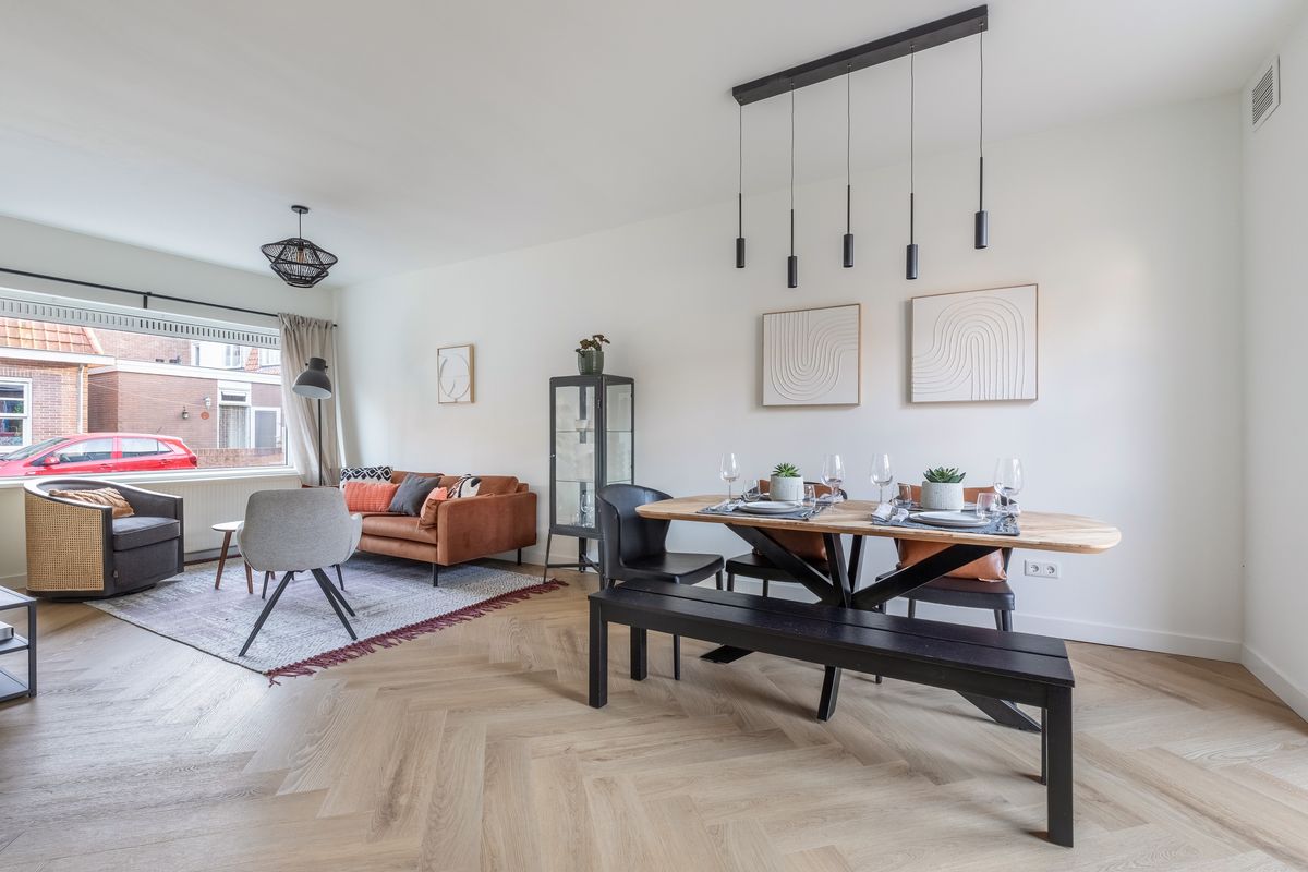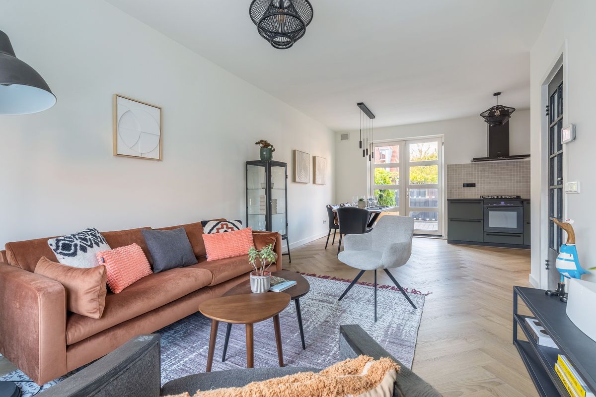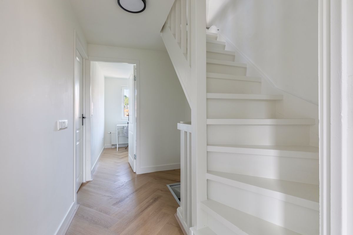 Je komt binnen in een nette hal met garderobe, meterkast en een modern betegeld toilet met fonteintje. De ruime, lichte woonkamer is voorzien van een stijlvolle visgraat pvc-vloer en strak afgewerkte wanden. Via dubbele openslaande deuren kom je in de zonnige tuin – een fijne verlenging van je leefruimte.