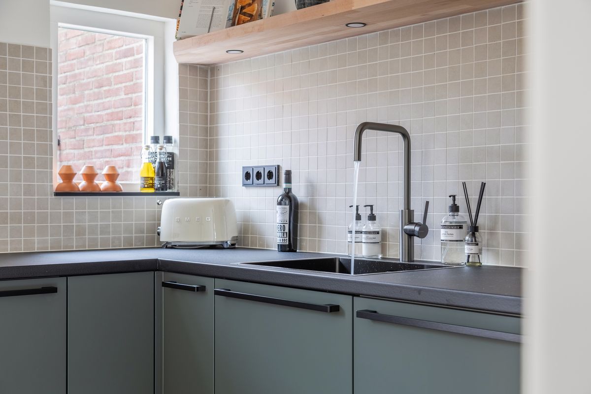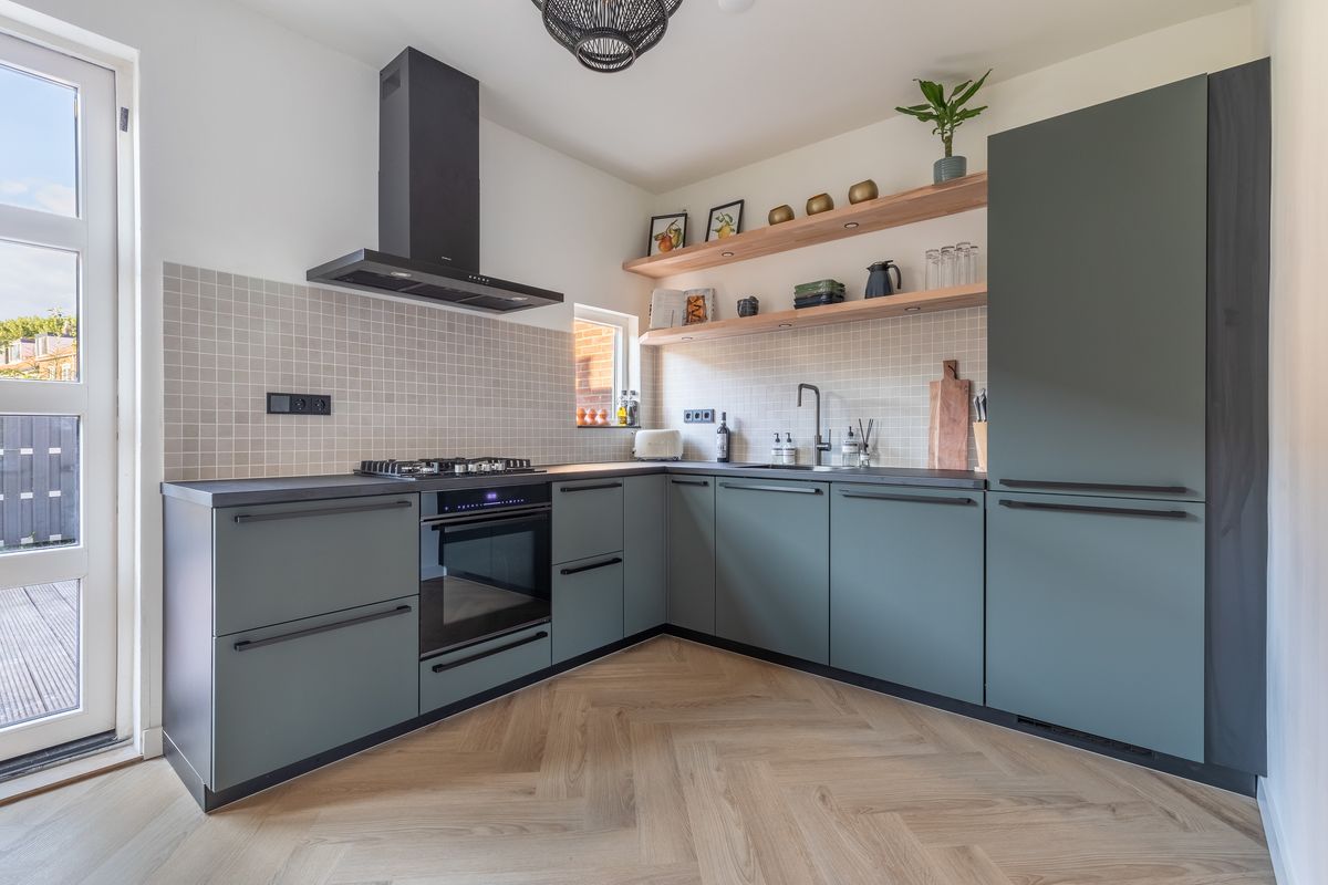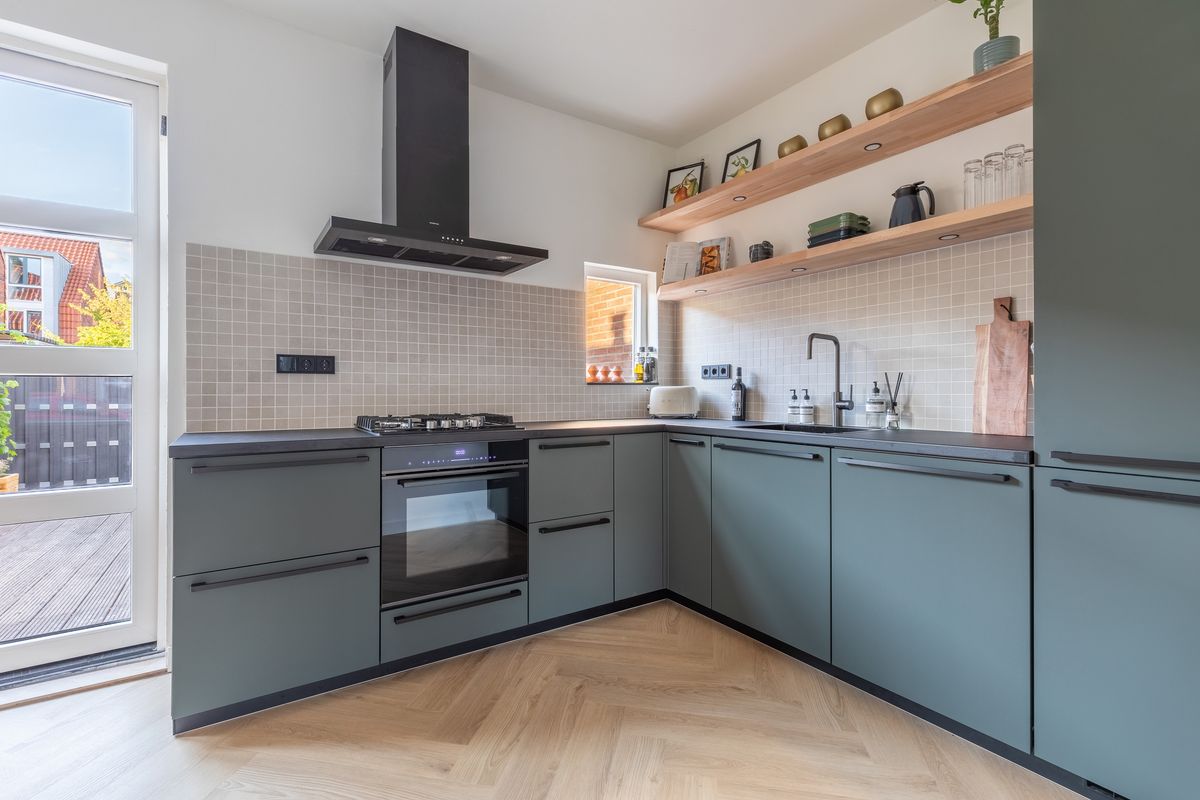 Aan de achterzijde vind je de moderne open keuken, die volledig is uitgerust met inbouwapparatuur zoals een 4-pits gaskookplaat, combioven, vaatwasser en een koel-/vriescombinatie. Dankzij de slimme indeling, het royale werkblad en het vele daglicht is koken hier elke dag een plezier.