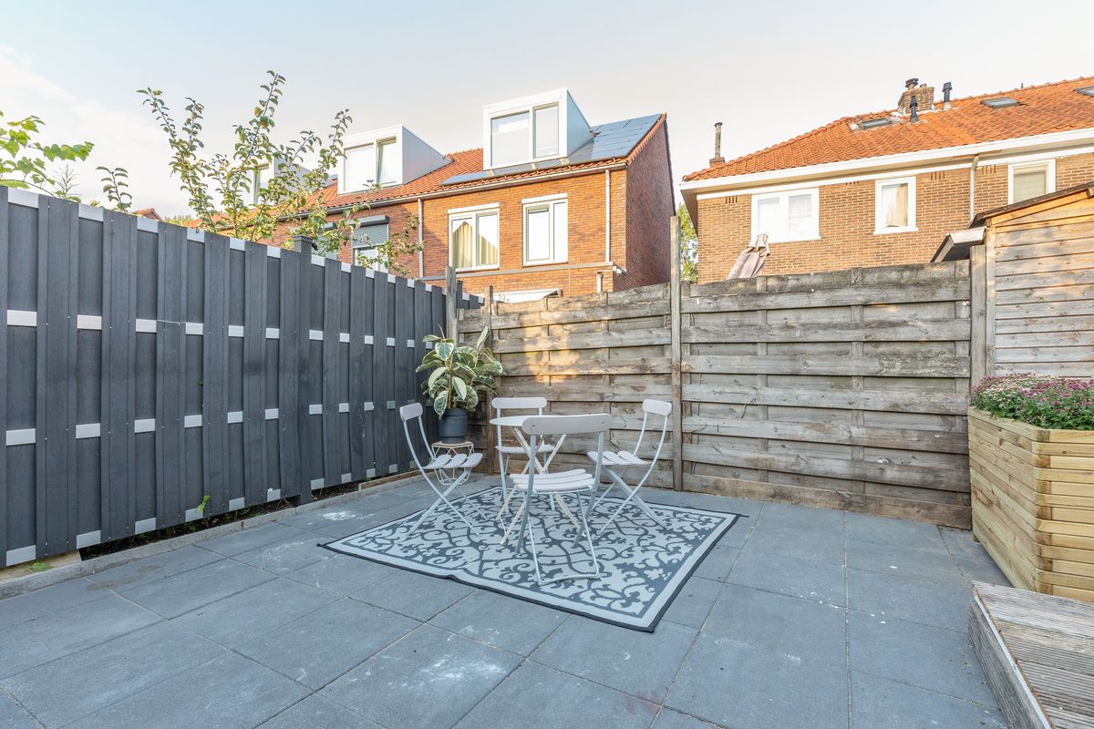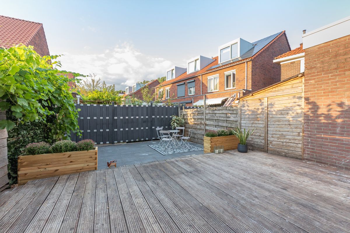 De onderhoudsvriendelijke tuin op het noordoosten bestaat uit een combinatie van houten vlonderplanken en betontegels. Ideaal om te relaxen, barbecueën of gezellig te borrelen met vrienden.
