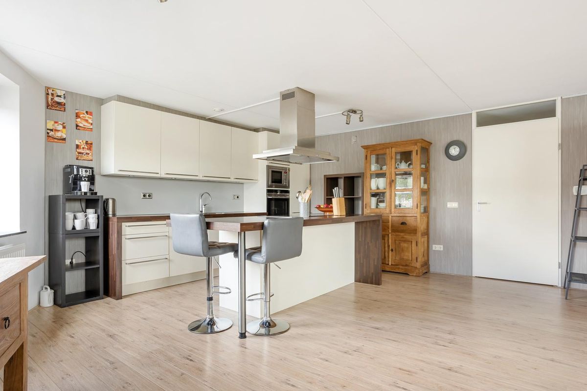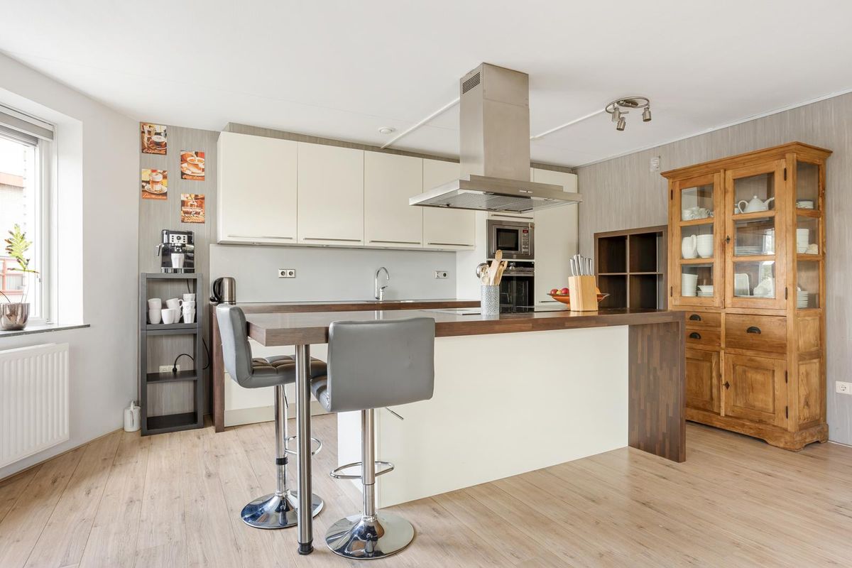 De woonkeuken is modern ingericht in lichte kleurstelling en voorzien van een kookeiland met bar, inductiekookplaat, oven, magnetron, koelkast, vriezer en vaatwasser – ideaal voor wie graag kookt en dineert in een sfeervolle ruimte. De gehele living is afgewerkt met een laminaatvloer.