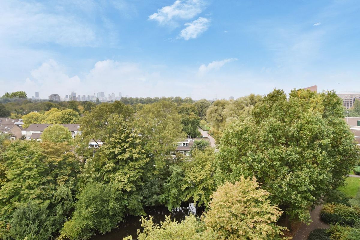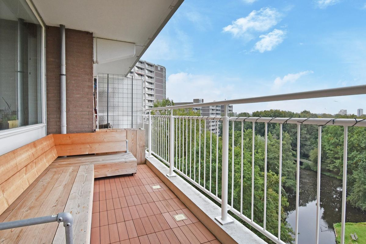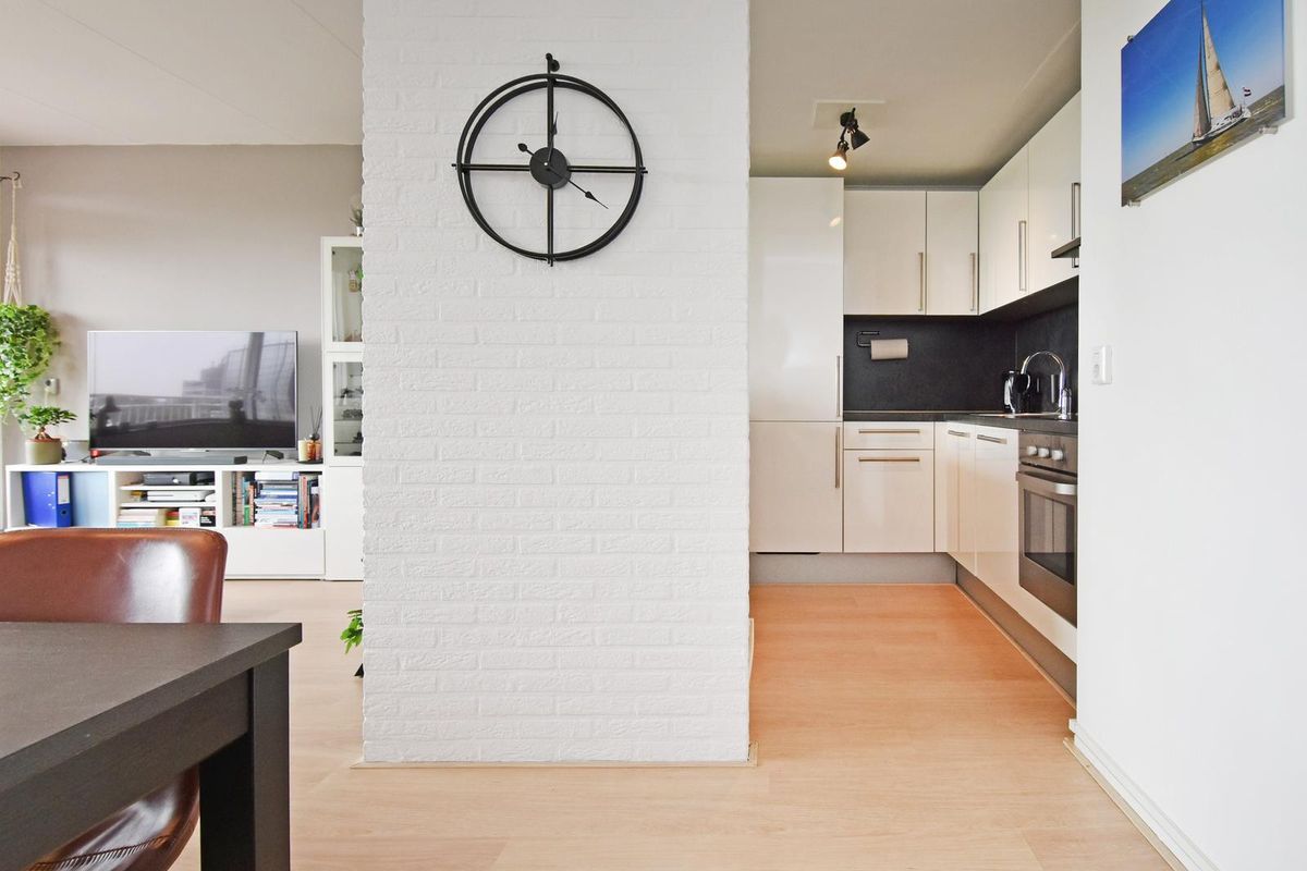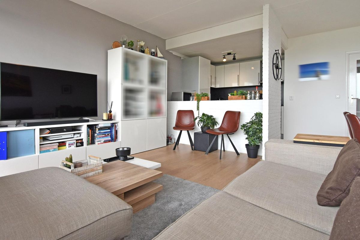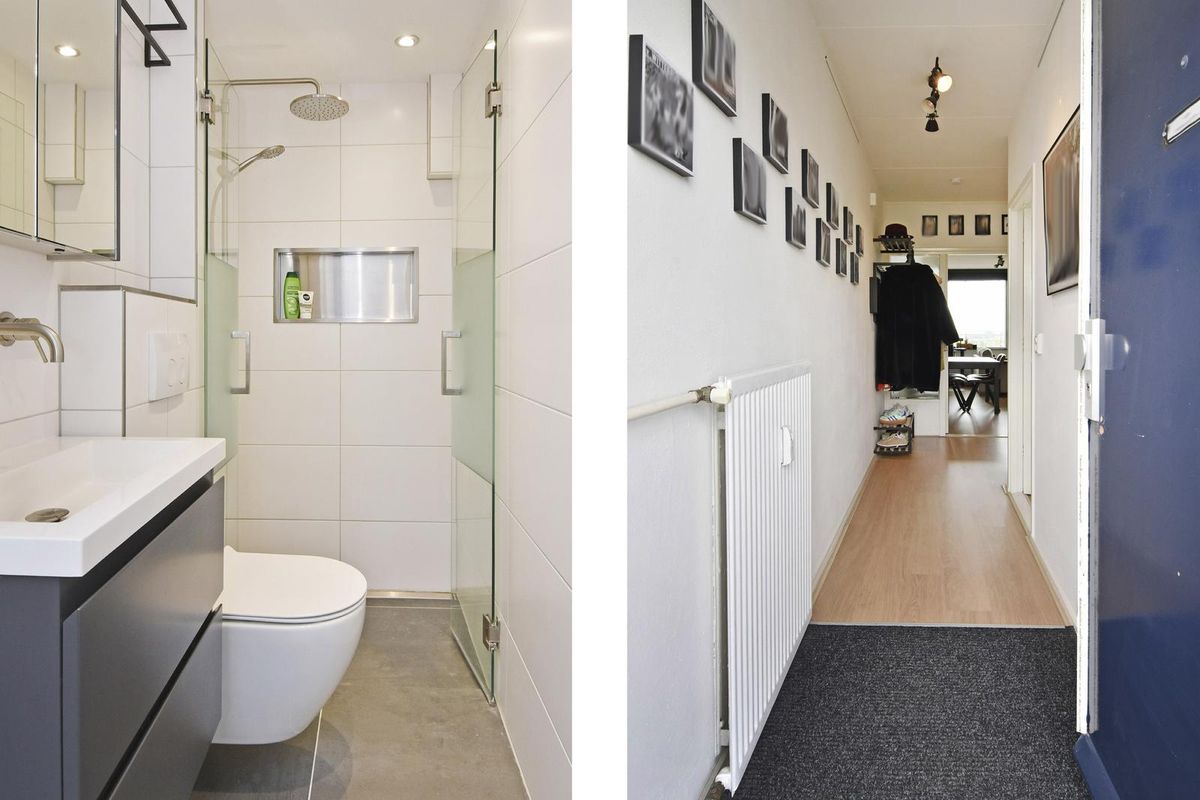 Entree appartement, ruime slaapkamer aan de voorzijde met vaste kast, gang met toegang tot de moderne luxe badkamer voorzien van inloopdouche, wastafelmeubel en modern vrijhangend toilet, woonkamer met semi open keuken voorzien van allerlei inbouwapparatuur wetende koel-/vriescombinatie, vaatwasser, oven, inductiekookplaat met afzuigkap en wasmachine opstelplaats, zonnig balkon (ZW) aan de achterzijde met uitzicht over fraai groen, water en de skyline van Den Haag.