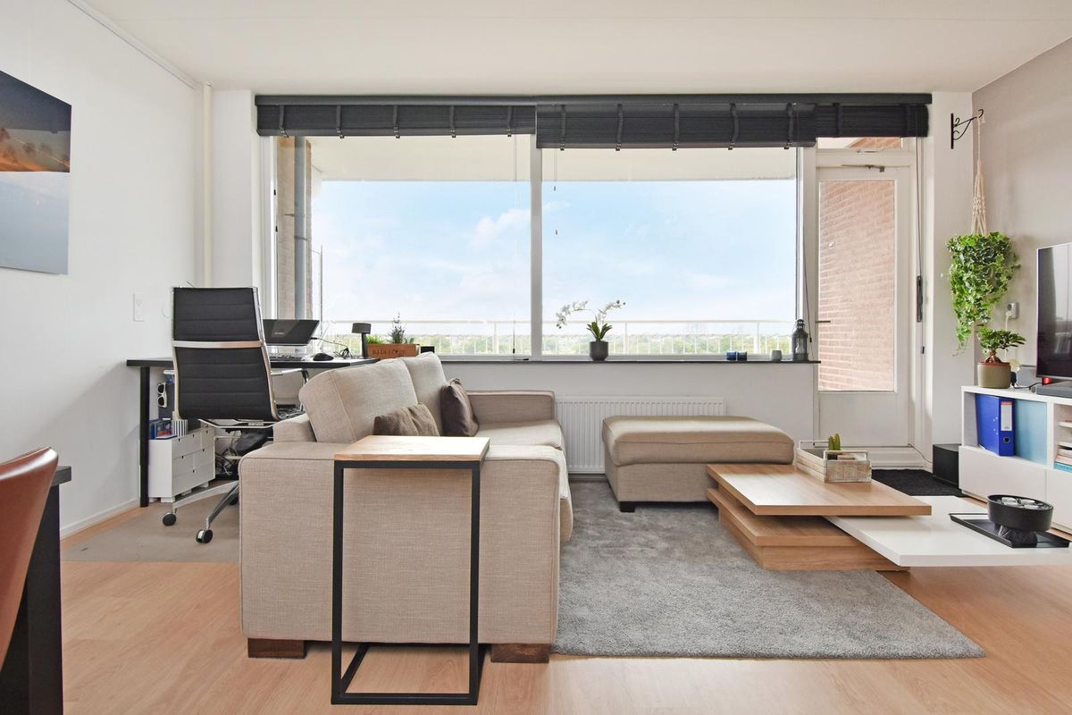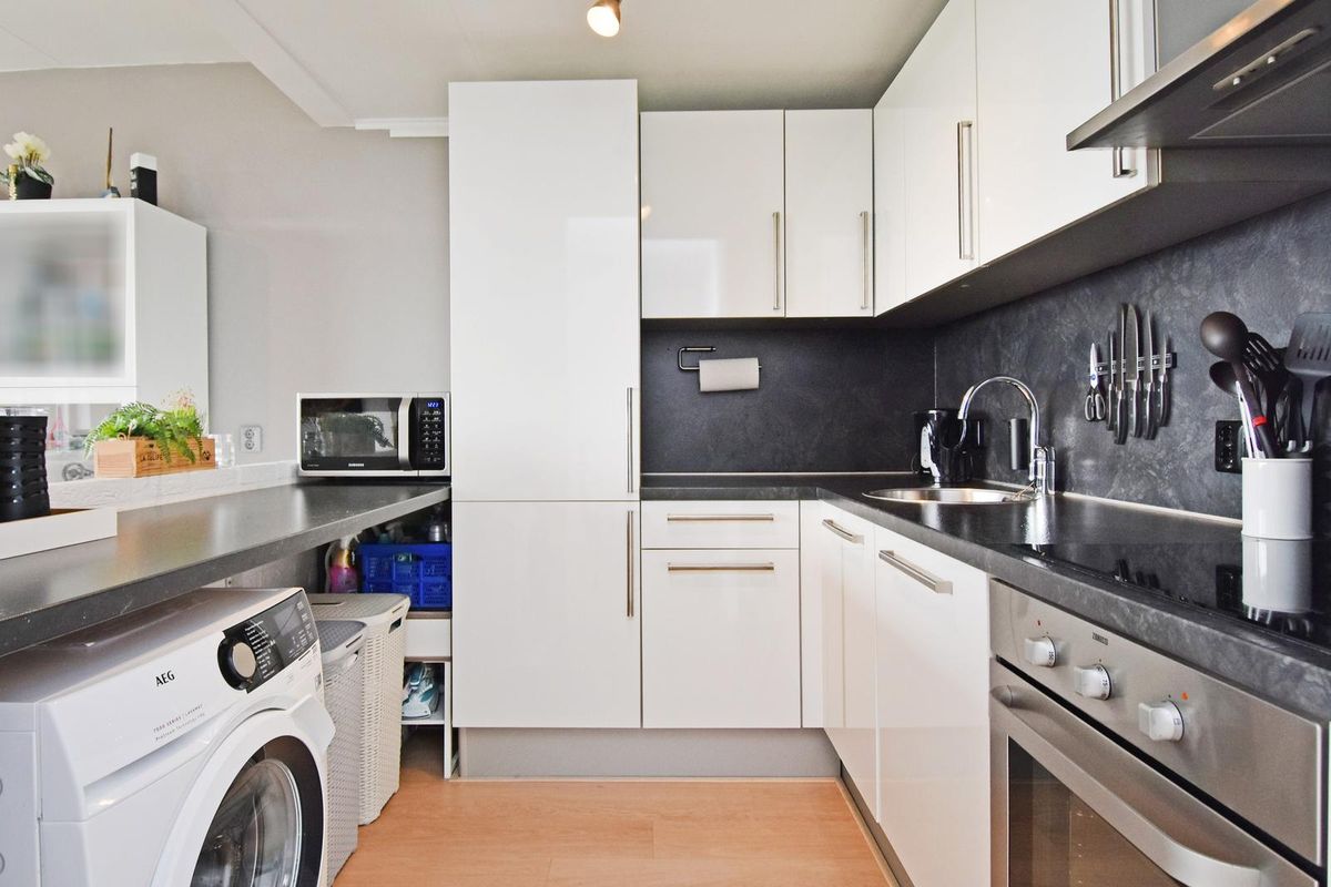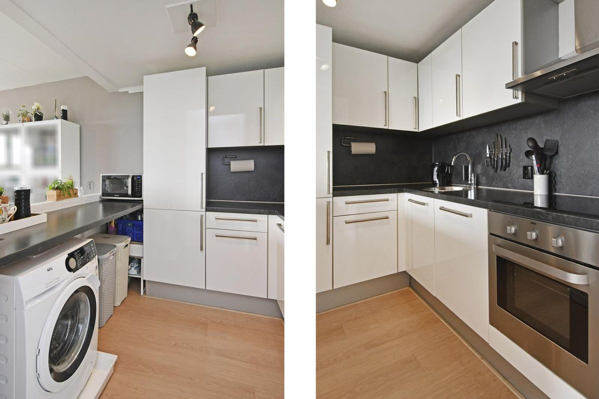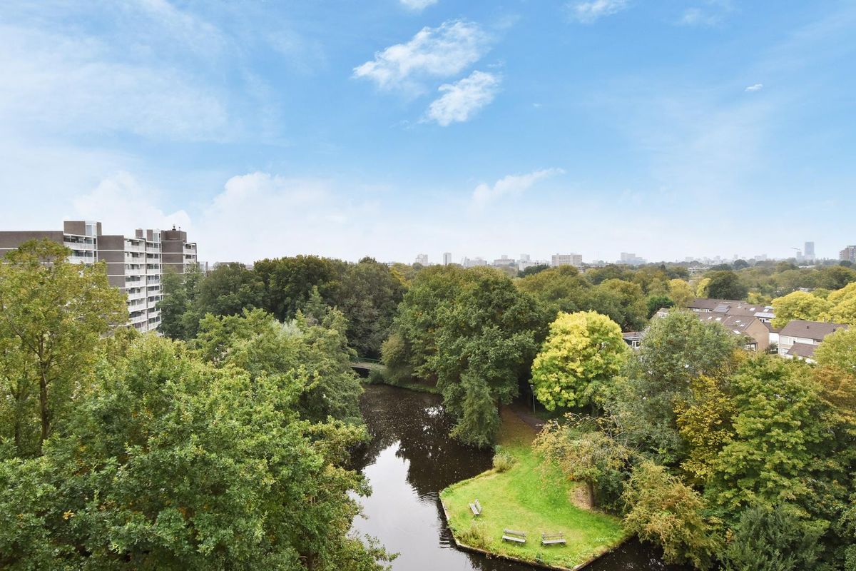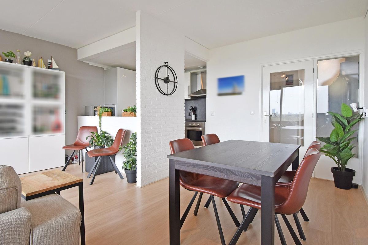 Entree appartement, ruime slaapkamer aan de voorzijde met vaste kast, gang met toegang tot de moderne luxe badkamer voorzien van inloopdouche, wastafelmeubel en modern vrijhangend toilet, woonkamer met semi open keuken voorzien van allerlei inbouwapparatuur wetende koel-/vriescombinatie, vaatwasser, oven, inductiekookplaat met afzuigkap en wasmachine opstelplaats, zonnig balkon (ZW) aan de achterzijde met uitzicht over fraai groen, water en de skyline van Den Haag.