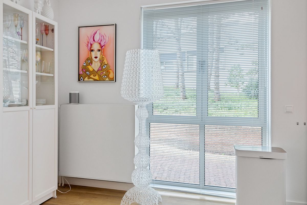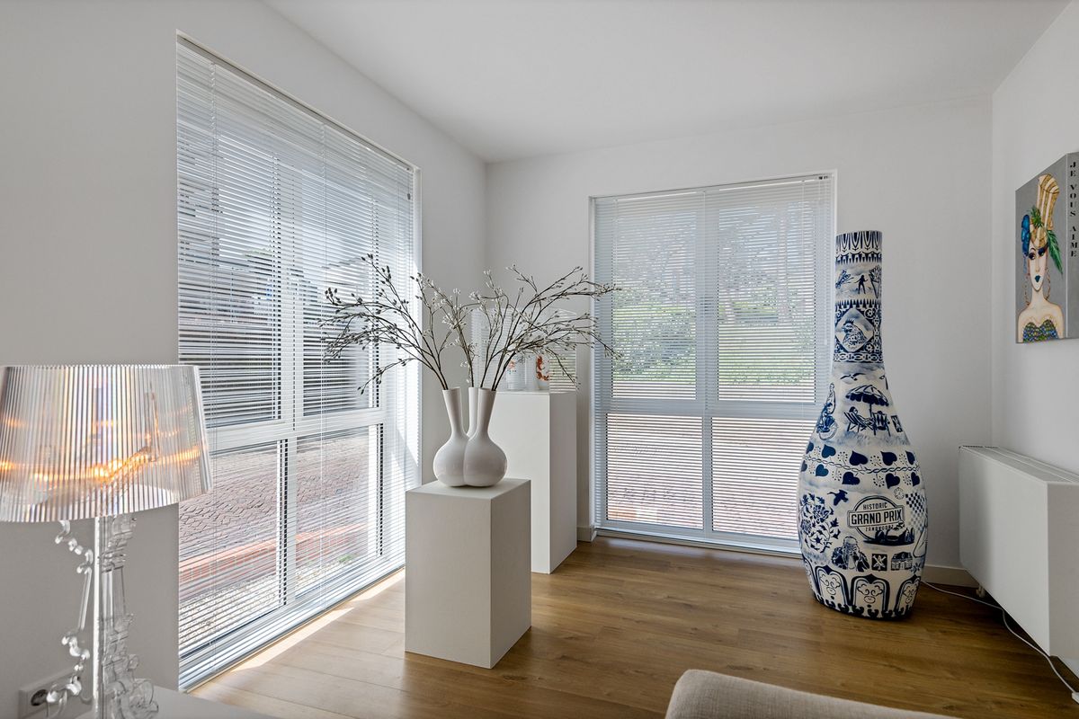 De lichte woonkamer zorgt voor een aangename leefruimte waar je kunt ontspannen en genieten van natuurlijk licht, door de openslaande deuren loop je zo het ruime balkon op.